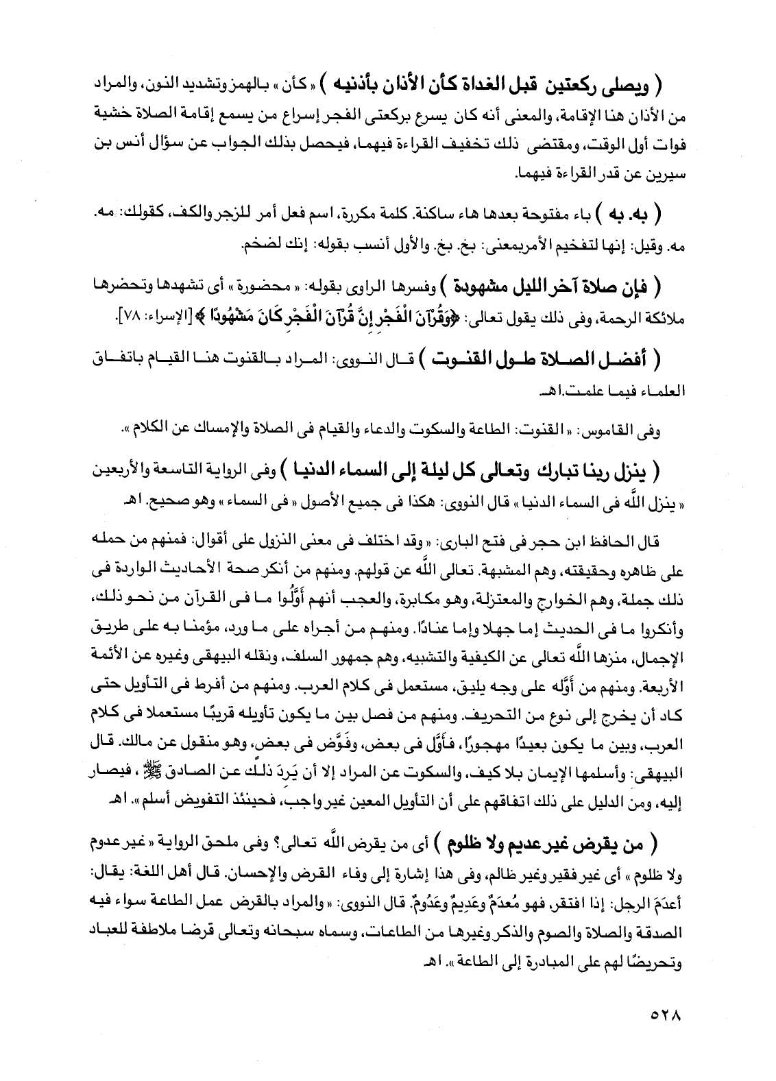 قال الحافظ ابن حجر في فتح الباري: "وقد اختلف في معنى النزول على أقوال: فمنهم من حمله على ظاهره وحقيقته، وهم المشبهة. تعالى اللَّه عن قولهم. ومنهم من أنكر صحة الأحاديث الواردة في ذلك جملة، وهم الخوارج والمعتزلة، وهو مكابرة، والعجب أنهم أَوَّلُوا ما في القرآن من نحو ذلك، وأنكروا ما في الحديث إما جهلاً وإما عنادًا. ومنهم من أجراه على ما ورد، مؤمنًا به على طريق الإجمال، منزهًا اللَّه تعالى عن الكيفية والتشبيه، وهم جمهور السلف، ونقله البيهقي وغيره عن الأئمة الأربعة. ومنهم من أَوَّله على وجه يليق، مستعمل في كلام العرب. ومنهم من أفرط في التأويل حتى كاد أن يخرج إلى نوع من التحريف. ومنهم من فصل بين ما يكون تأويله قريبًا مستعملاً في كلام العرب، وبين ما يكون بعيدًا مهجورًا، فأَوَّل في بعض، وفَوَّض في بعضٍ، وهو منقول عن مالك. قال البيهقي: وأسلمها الإيمان بلا كيف، والسكوت عن المراد إلا أن يَرِدَ ذلك عن الصادق صلى الله عليه وسلم، فيصار إليه، ومن الدليل على ذلك اتفاقهم على أن التأويل المعين غير واجب، فحينئذ التفويض أسلم". اهـ.