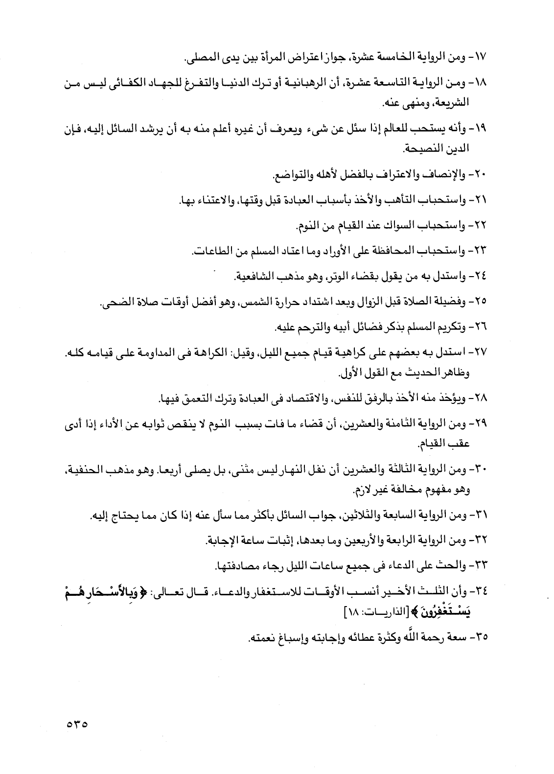 34 - وأن الثلث الأخير أنسب الأوقات للاستغفار والدعاء. قال تعالى: {وبالأسحار هم يستغفرون} [الذاريات: 18]