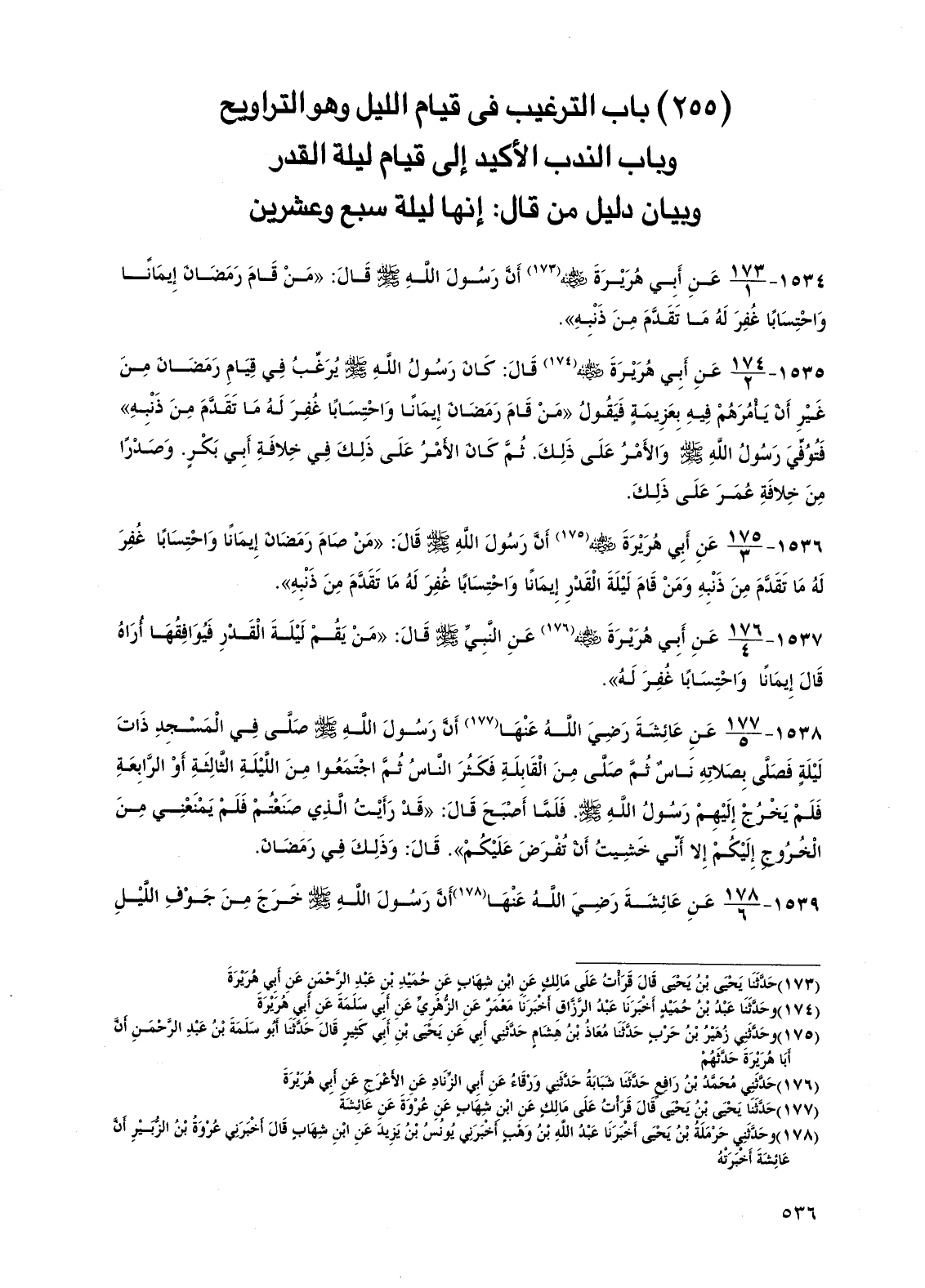(255) باب الترغيب في قيام الليل وهو التراويح وباب الندب الأكيد إلى قيام ليلة القدر وبيان دليل من قال: إنها ليلة سبع وعشرين
