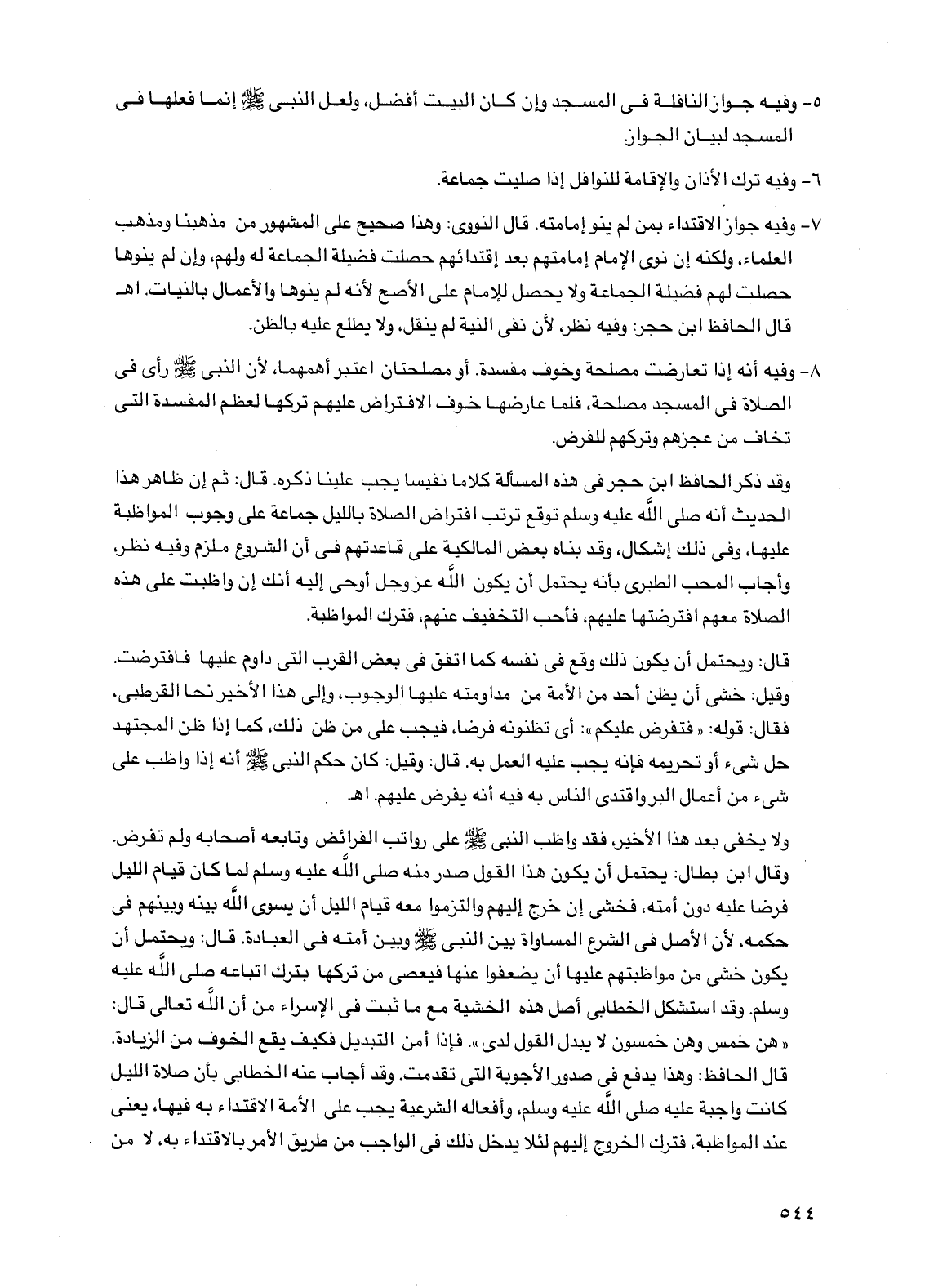 وقد ذكر الحافظ ابن حجر في هذه المسألة كلامًا نفيسًا يجب علينا ذكره. قال: ثم إن ظاهر هذا الحديث أنه صلى اللَّه عليه وسلم توقع ترتب افتراض الصلاة بالليل جماعة على وجوب المواظبة عليها، وفي ذلك إشكال، وقد بناه بعض المالكية على قاعدتهم في أن الشروع ملزم وفيه نظر، وأجاب المحب الطبري بأنه يحتمل أن يكون اللَّه عز وجل أوحى إليه أنك إن واظبت على هذه الصلاة معهم افترضتها عليهم، فأحب التخفيف عنهم، فترك المواظبة.