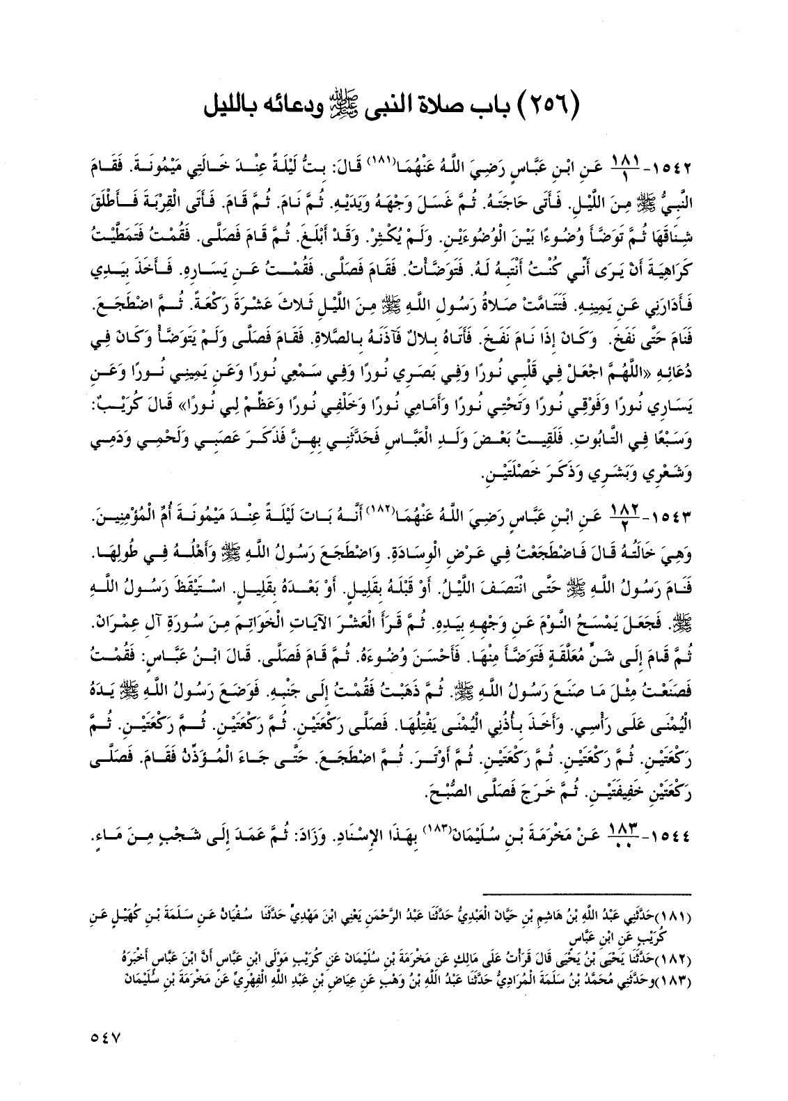 1542 - عن ابن عباس رضي الله عنهما قال: بت ليلةً عند خالتي ميمونة. فقام النبي صلى الله عليه وسلم من الليل. فأتى حاجته. ثم غسل وجهه ويديه. ثم نام. ثم قام. فأتى القربة فأطلق شناقها ثم توضأ وضوءًا بين الوضوءين. ولم يكثر. وقد أبلغ. ثم قام فصلى. فقمت فتمطيت كراهية أن يرى أني كنت أنتبه له. فتوضأت. فقام فصلى. فقمت عن يساره. فأخذ بيدي فأدارني عن يمينه. فتتامت صلاة رسول الله صلى الله عليه وسلم من الليل ثلاث عشرة ركعة. ثم اضطجع. فنام حتى نفخ. وكان إذا نام نفخ. فأتاه بلال فآذنه بالصلاة. فقام فصلى ولم يتوضأ وكان في دعائه "اللهم اجعل في قلبي نورًا وفي بصري نورًا وفي سمعي نورًا وعن يميني نورًا وعن يساري نورًا وفوقي نورًا وتحتي نورًا وأمامي نورًا وخلفي نورًا وعظم لي نورًا" قال كريب: وسبعًا في التابوت. فلقيت بعض ولد العباس فحدثني بهن فذكر عصبي ولحمي ودمي وشعري وبشري وذكر خصلتين.