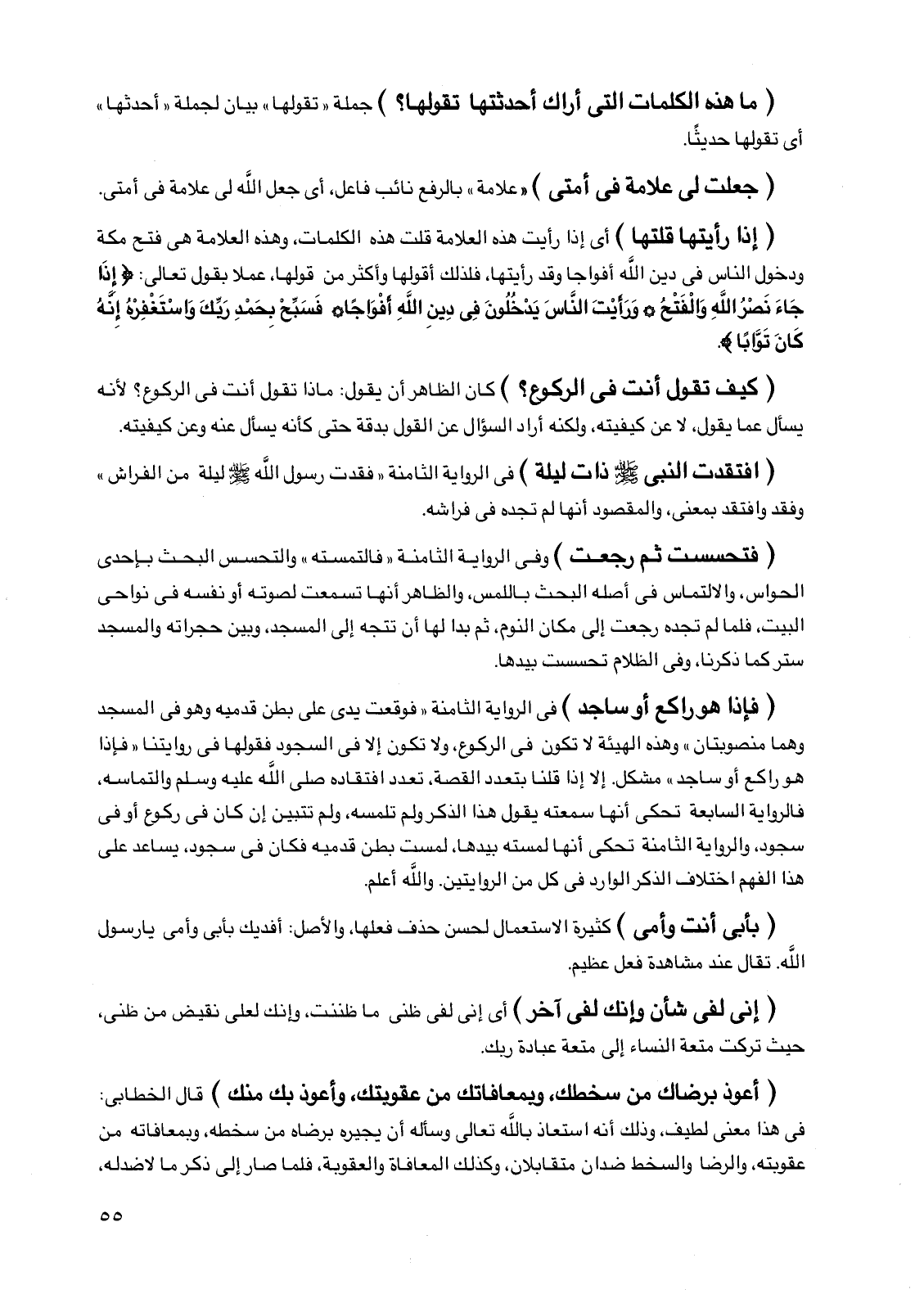 (فإذا هو راكع أو ساجد) في الرواية الثامنة "فوقعت يدي على بطن قدميه وهو في المسجد وهما منصوبتان وهذه الهيئة لا تكون في الركوع، ولا تكون إلا في السجود فقولها في روايتنا "فإذا هو راكع أو ساجد" مشكل. إلا إذا قلنا بتعدد القصة، تعدد افتقاده صلى الله عليه وسلم والتماسه، فالرواية السابعة تحكي أنها سمعته يقول هذا الذكر ولم تلمسه، ولم تتبين إن كان في ركوع أو في سجود، والرواية الثامنة تحكي أنها لمسته بيدها، لمست بطن قدميه فكان في سجود، يساعد على هذا الفهم اختلاف الذكر الوارد في كل من الروايتين. والله أعلم.