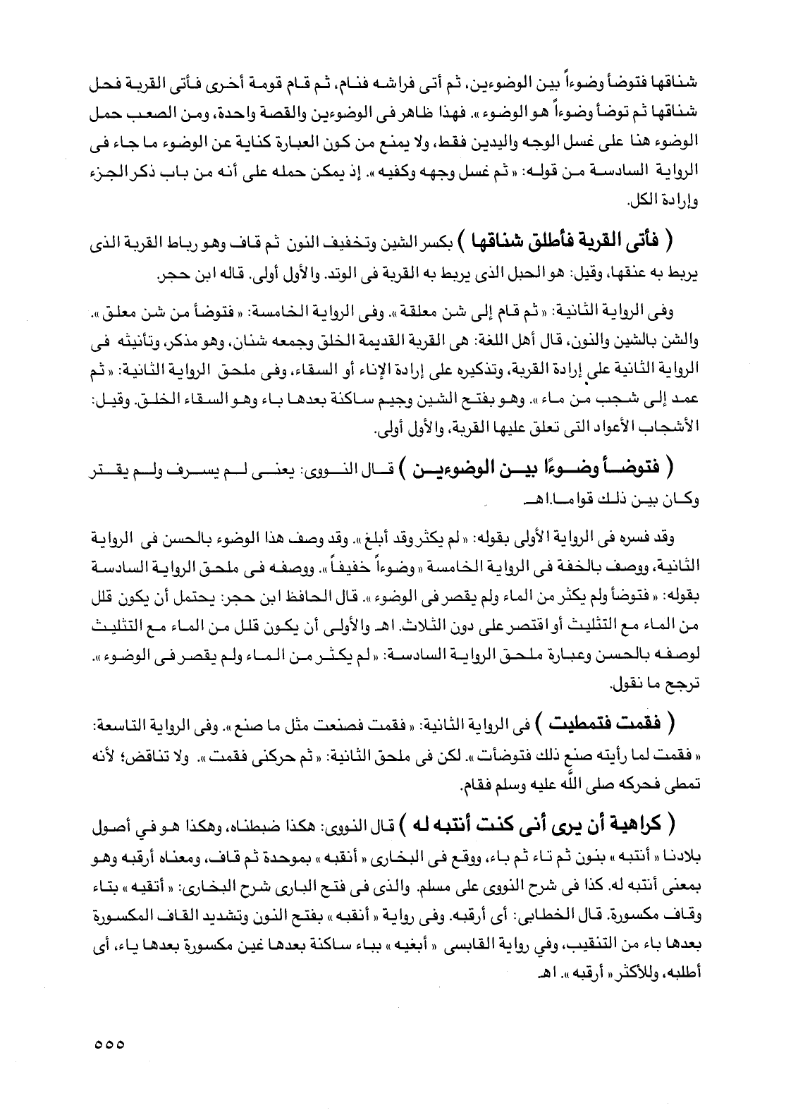 وفي الرواية الثانية: "ثم قام إلى شن معلقة". وفي الرواية الخامسة: "فتوضأ من شن معلق". والشن بالشين والنون، قال أهل اللغة: هي القربة القديمة الخلق وجمعه شنان، وهو مذكر، وتأنيثه في الرواية الثانية على إرادة القربة، وتذكيره على إرادة الإناء أو السقاء، وفي ملحق الرواية الثانية: "ثم عمد إلى شجب من ماء". وهو بفتح الشين وجيم ساكنة بعدها باء وهو السقاء الخلق. وقيل: الأشجاب الأعواد التي تعلق عليها القربة، والأول أولى.