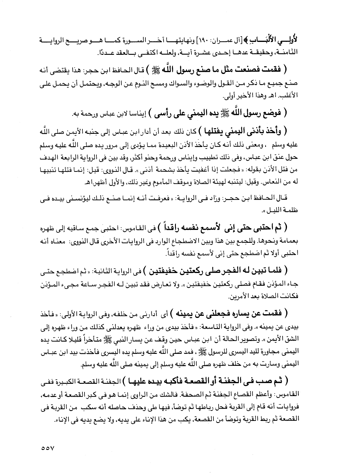 (فقمت فصنعت مثل ما صنع رسول اللَّه صلى الله عليه وسلم) قال الحافظ ابن حجر: هذا يقتضي أنه صنع جميع ما ذكر من القول والوضوء والسواك ومسح النوم عن الوجه، ويحتمل أن يحمل على الأغلب. اهـ وهذا الأخير أولى.