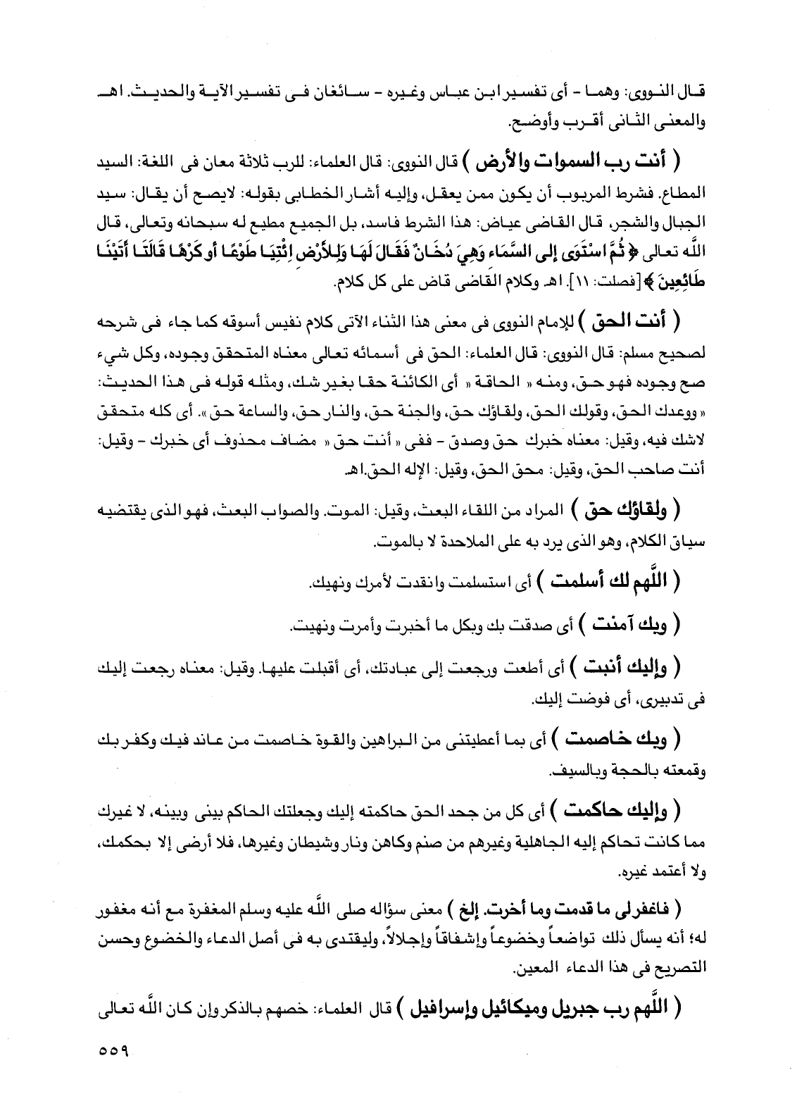 (أنت رب السموات والأرض) قال النووي: قال العلماء: للرب ثلاثة معان في اللغة: السيد المطاع. فشرط المربوب أن يكون ممن يعقل، وإليه أشار الخطابي بقوله: لا يصح أن يقال: سيد الجبال والشجر، قال القاضي عياض: هذا الشرط فاسد، بل الجميع مطيع له سبحانه وتعالى، قال الله تعالى {ثم استوى إلى السماء وهي دخان فقال لها وللأرض ائتيا طوعًا أو كرهًا قالتا أتينا طائعين} [فصلت: 11]. اهـ. وكلام القاضي قاض على كل كلام.