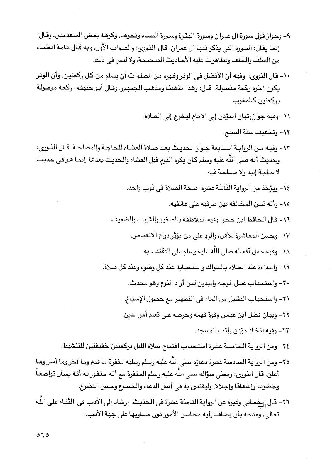 10 - قال النووي: وفيه أن الأفضل في الوتر وغيره من الصلوات أن يسلم من كل ركعتين، وأن الوتر يكون آخره ركعة مفصولة. قال: وهذا مذهبنا ومذهب الجمهور. وقال أبو حنيفة: ركعة موصولة بركعتين كالمغرب.