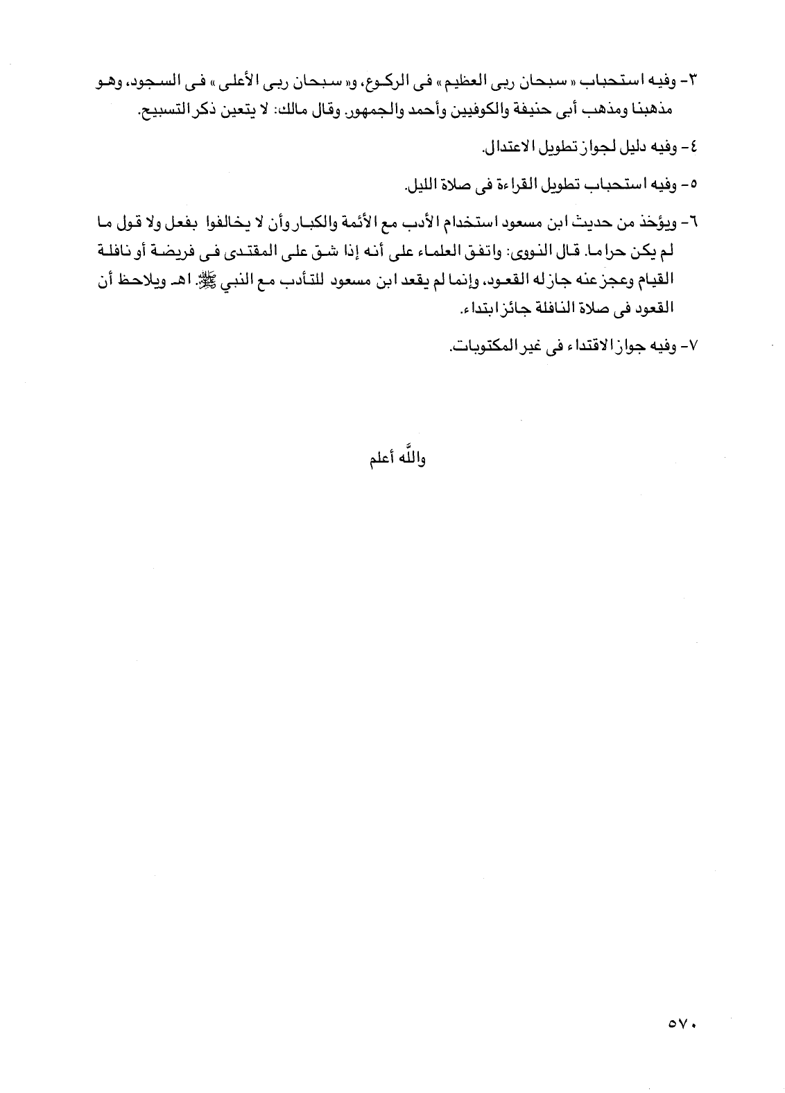 6 - ويؤخذ من حديث ابن مسعود استخدام الأدب مع الأئمة والكبار وأن لا يخالفوا بفعل ولا قول ما لم يكن حرامًا. قال النووي: واتفق العلماء على أنه إذا شق على المقتدي في فريضة أو نافلة القيام وعجز عنه جاز له القعود، وإنما لم يقعد ابن مسعود للتأدب مع النبي صلى الله عليه وسلم. اهـ. ويلاحظ أن القعود في صلاة النافلة جائز ابتداءً.