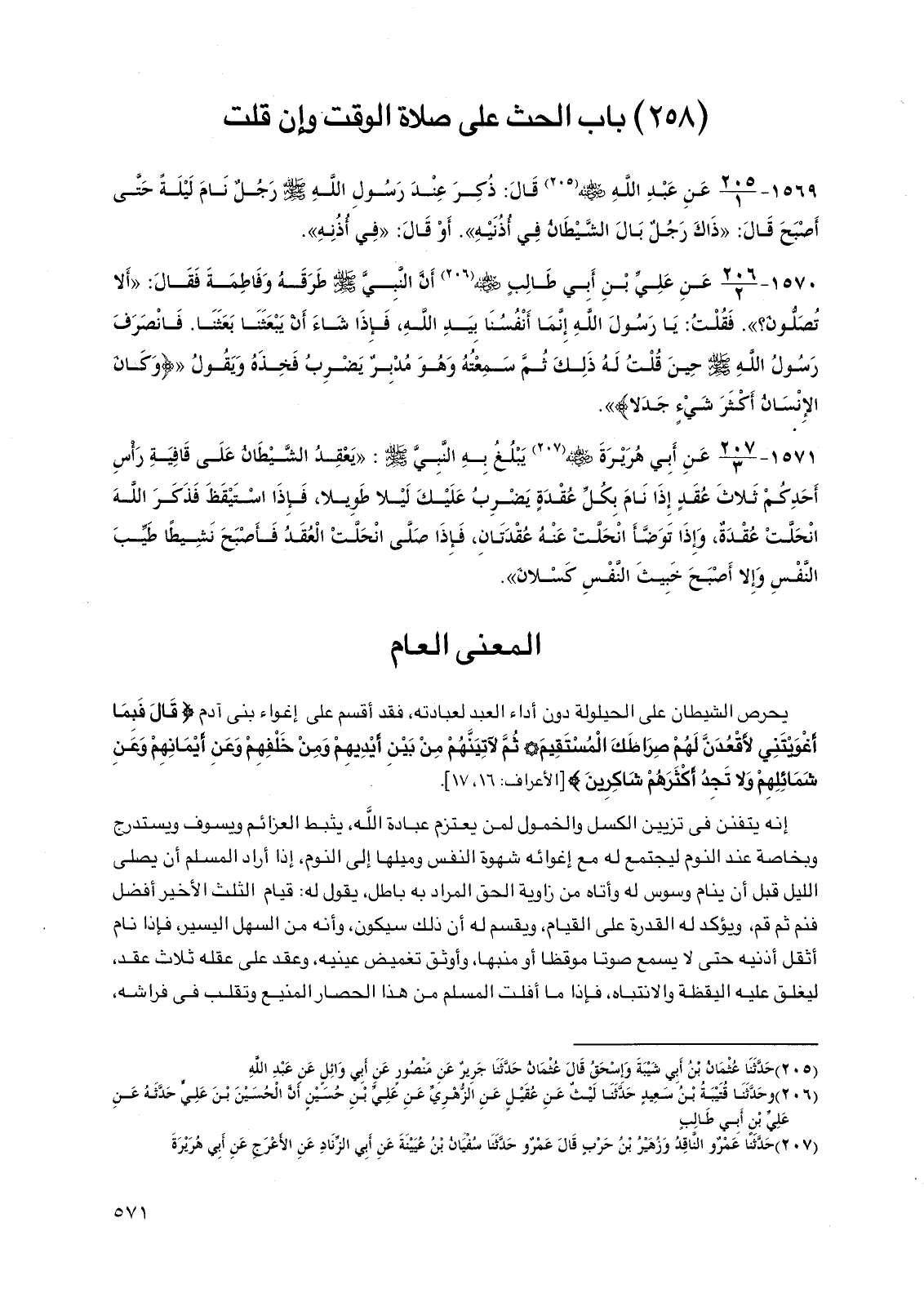 1571 - عن أبي هريرة رضي الله عنه يبلغ به النبي صلى الله عليه وسلم: "يعقد الشيطان على قافية رأس أحدكم ثلاث عقد إذا نام بكل عقدة يضرب عليك ليلاً طويلاً، فإذا استيقظ فذكر الله انحلت عقدة، وإذا توضأ انحلت عنه عقدتان، فإذا صلى انحلت العقد فأصبح نشيطًا طيب النفس وإلا أصبح خبيث النفس كسلان".