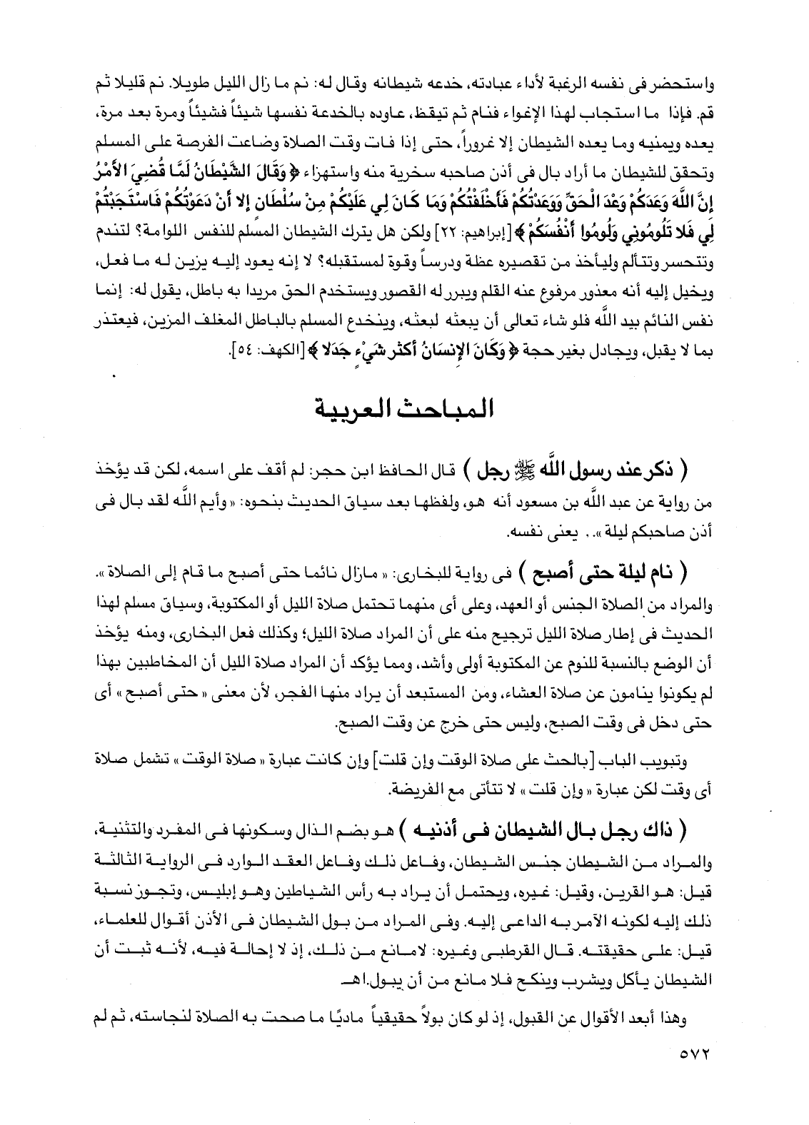 (ذاك رجل بال الشيطان في أذنيه) هو بضم الذال وسكونها في المفرد والتثنية، والمراد من الشيطان جنس الشيطان، وفاعل ذلك وفاعل العقد الوارد في الرواية الثالثة قيل: هو القرين، وقيل: غيره، ويحتمل أن يراد به رأس الشياطين وهو إبليس، وتجوز نسبة ذلك إليه لكونه الآمر به الداعي إليه. وفي المراد من بول الشيطان في الأذن أقوال للعلماء، قيل: على حقيقته. قال القرطبي وغيره: لا مانع من ذلك، إذ لا إحالة فيه، لأنه ثبت أن الشيطان يأكل ويشرب وينكح فلا مانع من أن يبول. اهـ.