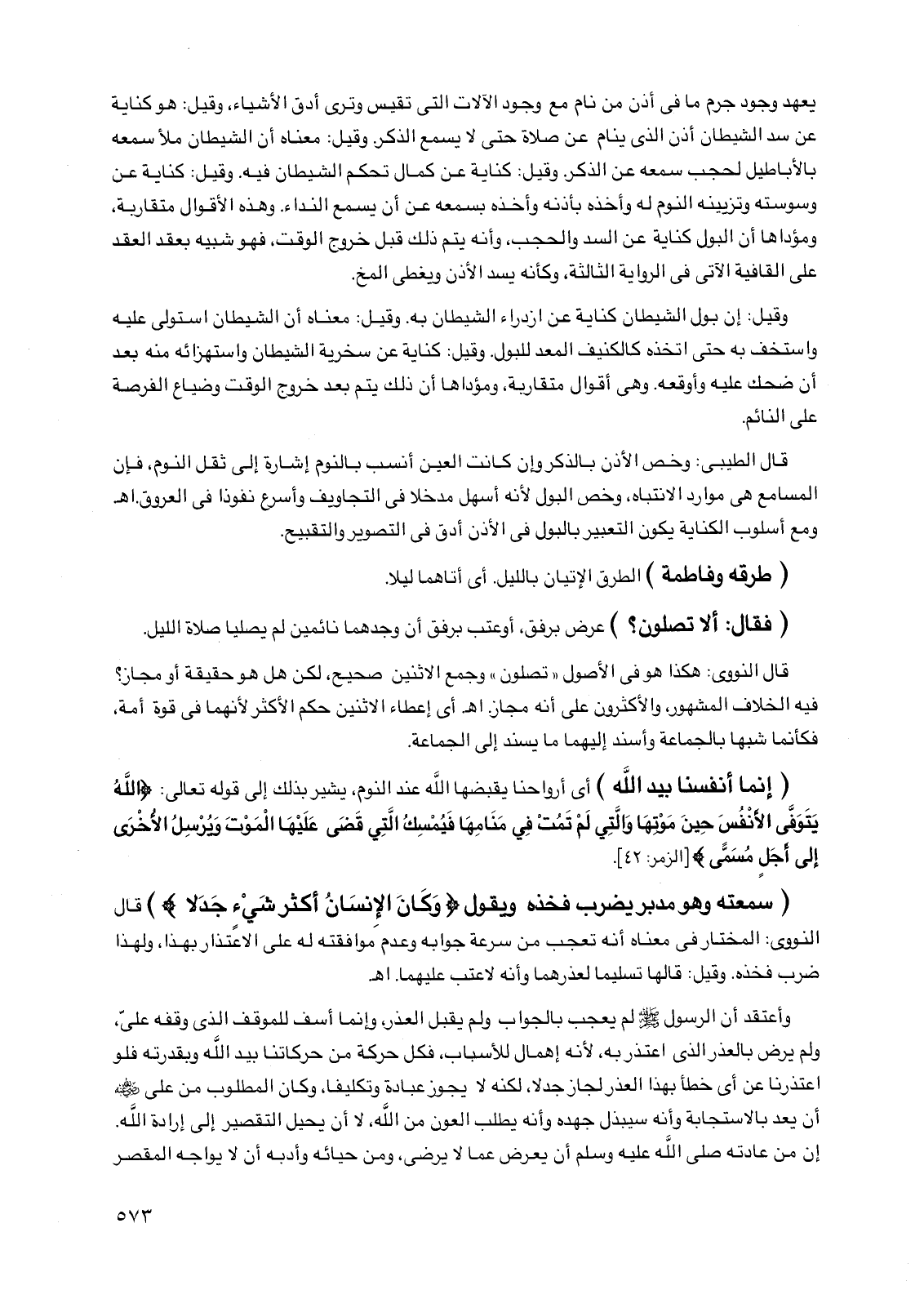 (سمعته وهو مدبر يضرب فخذه ويقول {وكان الإنسان أكثر شيء جدلاً}) قال النووي: المختار في معناه أنه تعجب من سرعة جوابه وعدم موافقته له على الاعتذار بهذا، ولهذا ضرب فخذه. وقيل: قالها تسليمًا لعذرهما وأنه لا عتب عليهما. اهـ