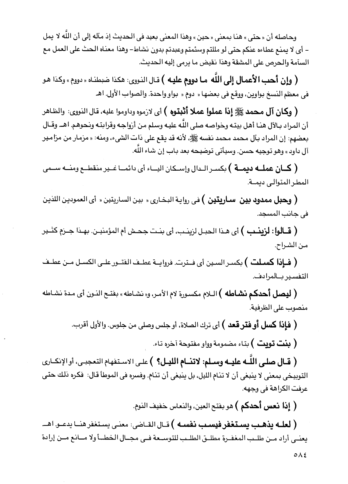 (وإن أحب الأعمال إلى اللَّه ما دووم عليه) قال النووي: هكذا ضبطناه "دووم" وكذا هو في معظم النسخ بواوين، ووقع في بعضها "دوم" بواو واحدة. والصواب الأول. اهـ.