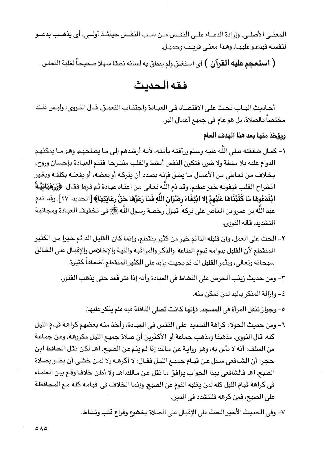 6 - ومن حديث الحولاء كراهة التشديد على النفس في العبادة، وأخذ منه بعضهم كراهة قيام الليل كله. قال النووي. مذهبنا ومذهب جماعة أو الأكثرين أن صلاة جميع الليل مكروهة، وعن جماعة من السلف: أنه لا بأس به، وهو رواية عن مالك إذا لم ينم عن الصبح. اهـ. لكن نقل الحافظ ابن حجر: أن الشافعي سئل عن قيام جميع الليل فقال: لا أكرهه إلا لمن خشي أن يضر بصلاة الصبح. اهـ. فالشافعي بهذا الجواب يوافق ما نقل عن مالك. اهـ. ولا أظن خلافًا وقع بين العلماء في كراهة قيام الليل كله لمن يغلبه النوم عن الصبح. وإنما الخلاف في قيامه كله مع المحافظة على الصبح، فمن كرهه فللتشدد في الدين.