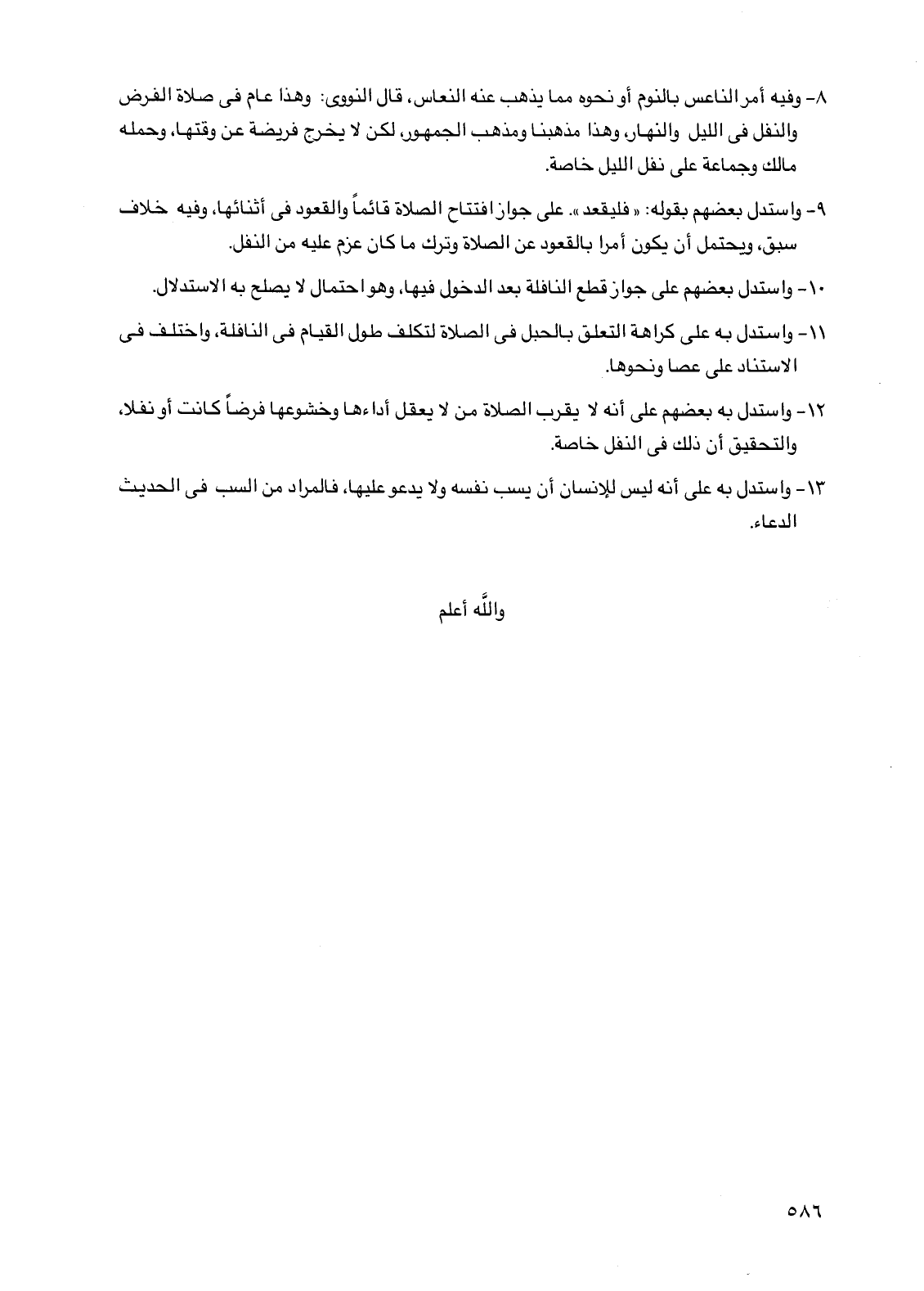 8 - وفيه أمر الناعس بالنوم أو نحوه مما يذهب عنه النعاس، قال النووي: وهذا عام في صلاة الفرض والنفل في الليل والنهار، وهذا مذهبنا ومذهب الجمهور، لكن لا يخرج فريضة عن وقتها، وحمله مالك وجماعة على نفل الليل خاصة.