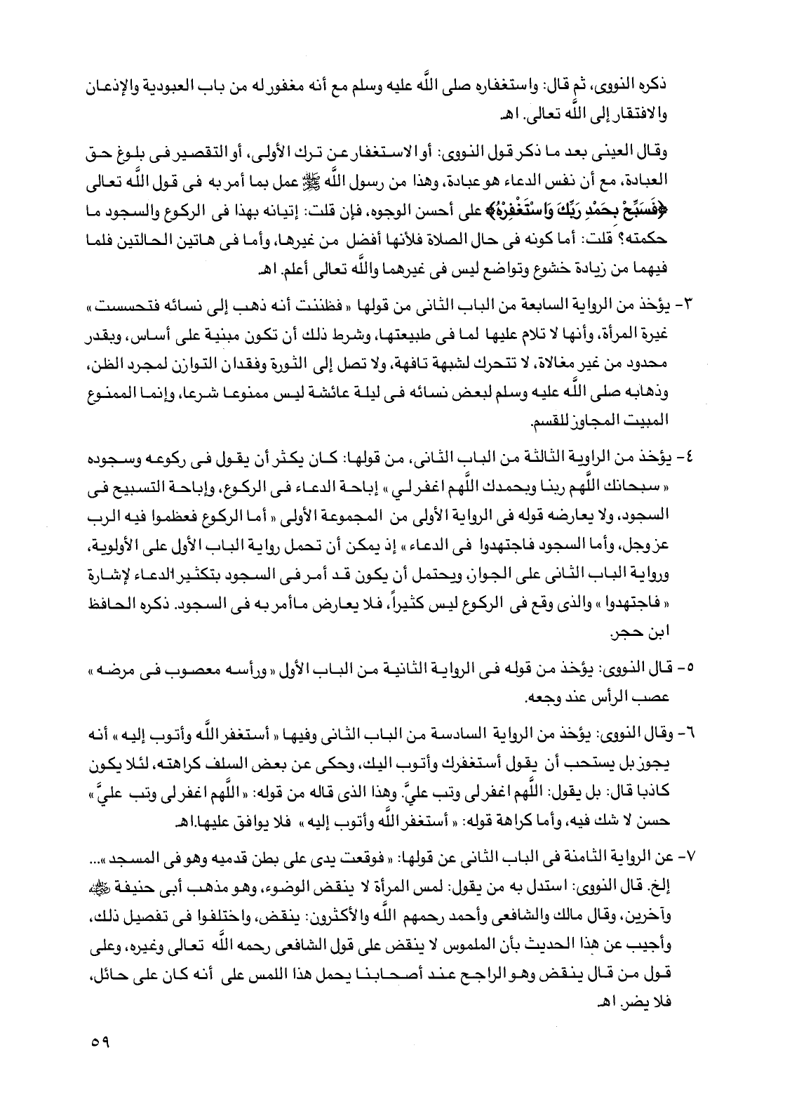 4 - يؤخذ من الرواية الثالثة من الباب الثاني، من قولها: كان يكثر أن يقول في ركوعه وسجوده "سبحانك اللهم ربنا وبحمدك اللهم اغفر لي" إباحة الدعاء في الركوع، وإباحة التسبيح في السجود، ولا يعارضه قوله في الرواية الأولى من المجموعة الأولى "أما الركوع فعظموا فيه الرب عز وجل، وأما السجود فاجتهدوا في الدعاء" إذ يمكن أن تحمل رواية الباب الأول على الأولوية، ورواية الباب الثاني على الجواز، ويحتمل أن يكون قد أمر في السجود بتكثير الدعاء لإشارة "فاجتهدوا" والذي وقع في الركوع ليس كثيرًا، فلا يعارض ما أمر به في السجود، ذكره الحافظ ابن حجر.
