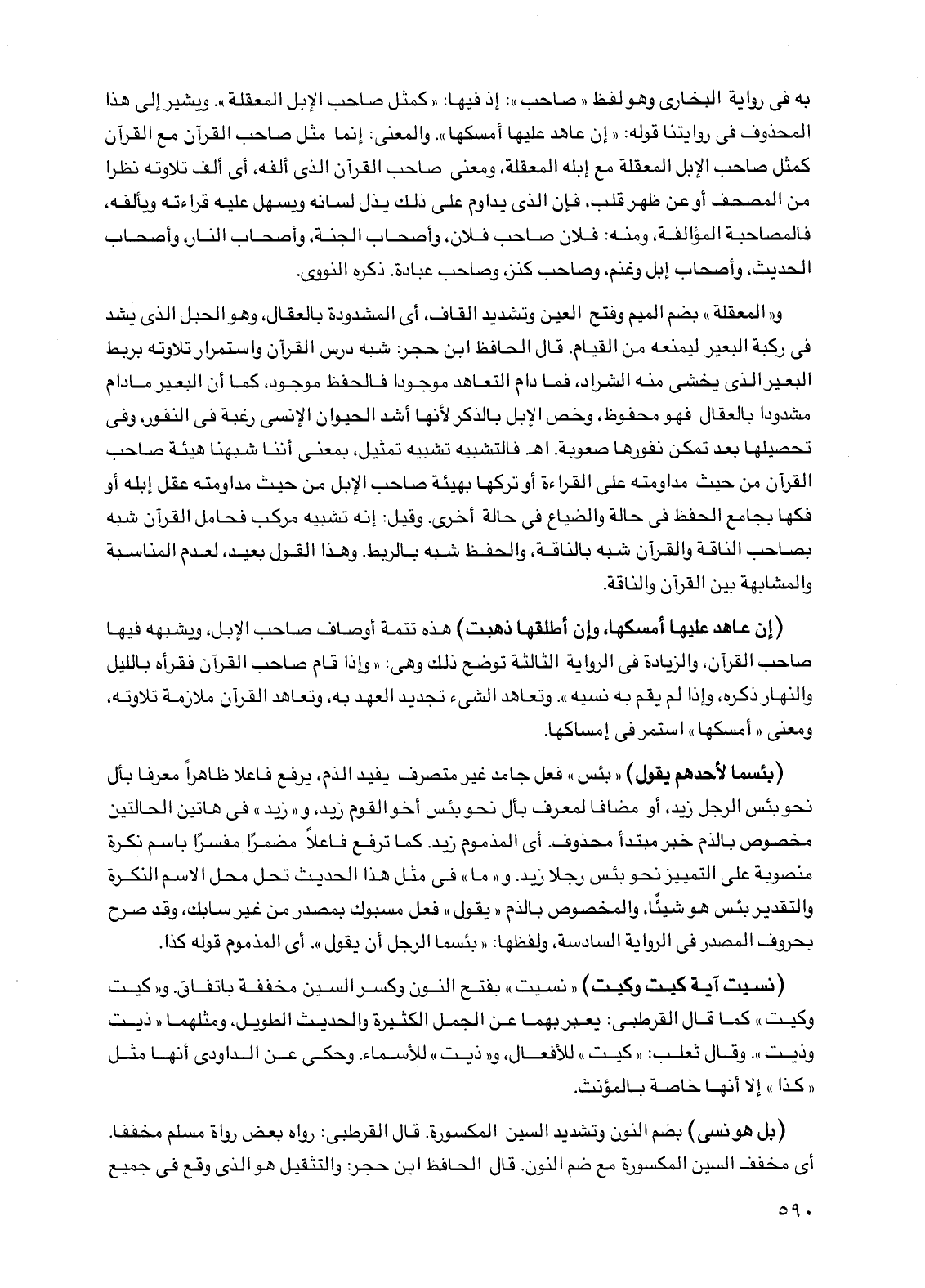 به في رواية البخاري وهو لفظ "صاحب": إذ فيها: "كمثل صاحب الإبل المعقلة". ويشير إلى هذا المحذوف في روايتنا قوله: "إن عاهد عليها أمسكها". والمعنى: إنما مثل صاحب القرآن مع القرآن كمثل صاحب الإبل المعقلة مع إبله المعقلة، ومعنى صاحب القرآن الذي ألفه، أي ألف تلاوته نظرًا من المصحف أو عن ظهر قلب، فإن الذي يداوم على ذلك يذل لسانه ويسهل عليه قراءته ويألفه، فالمصاحبة المؤالفة، ومنه: فلان صاحب فلان، وأصحاب الجنة، وأصحاب النار، وأصحاب الحديث، وأصحاب إبل وغنم، وصاحب كنز، وصاحب عبادة. ذكره النووي.