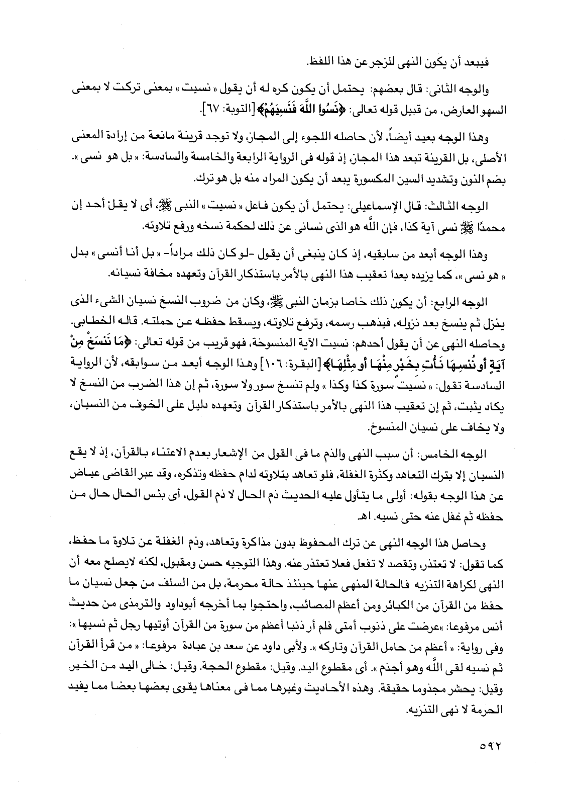 الوجه الرابع: أن يكون ذلك خاصًا بزمان النبي صلى الله عليه وسلم، وكان من ضروب النسخ نسيان الشيء الذي ينزل ثم ينسخ بعد نزوله، فيذهب رسمه، وترفع تلاوته، ويسقط حفظه عن حملته. قاله الخطابي. وحاصله النهي عن أن يقول أحدهم: نسيت الآية المنسوخة، فهو قريب من قوله تعالى: {ما ننسخ من آية أو ننسها نأت بخير منها أو مثلها} [البقرة: 106] وهذا الوجه أبعد من سوابقه، لأن الرواية السادسة تقول: "نسيت سورة كذا وكذا" ولم تنسخ سور ولا سورة، ثم إن هذا الضرب من النسخ لا يكاد يثبت، ثم إن تعقيب هذا النهي بالأمر باستذكار القرآن وتعهده دليل على الخوف من النسيان، ولا يخاف على نسيان المنسوخ.