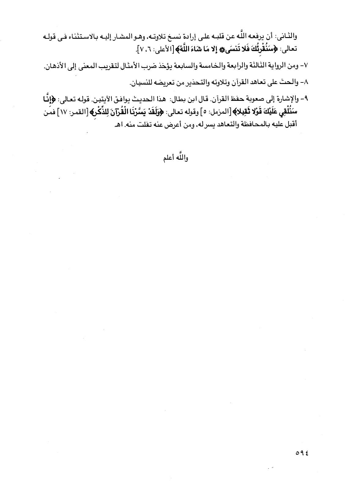 9 - والإشارة إلى صعوبة حفظ القرآن. قال ابن بطال: هذا الحديث يوافق الآيتين. قوله تعالى: {إنا سنلقي عليك قولاً ثقيلاً} [المزمل: 5] وقوله تعالى: {ولقد يسرنا القرآن للذكر} [القمر: 17] فمن أقبل عليه بالمحافظة والتعاهد يسر له، ومن أعرض عنه تفلت منه. اهـ.
