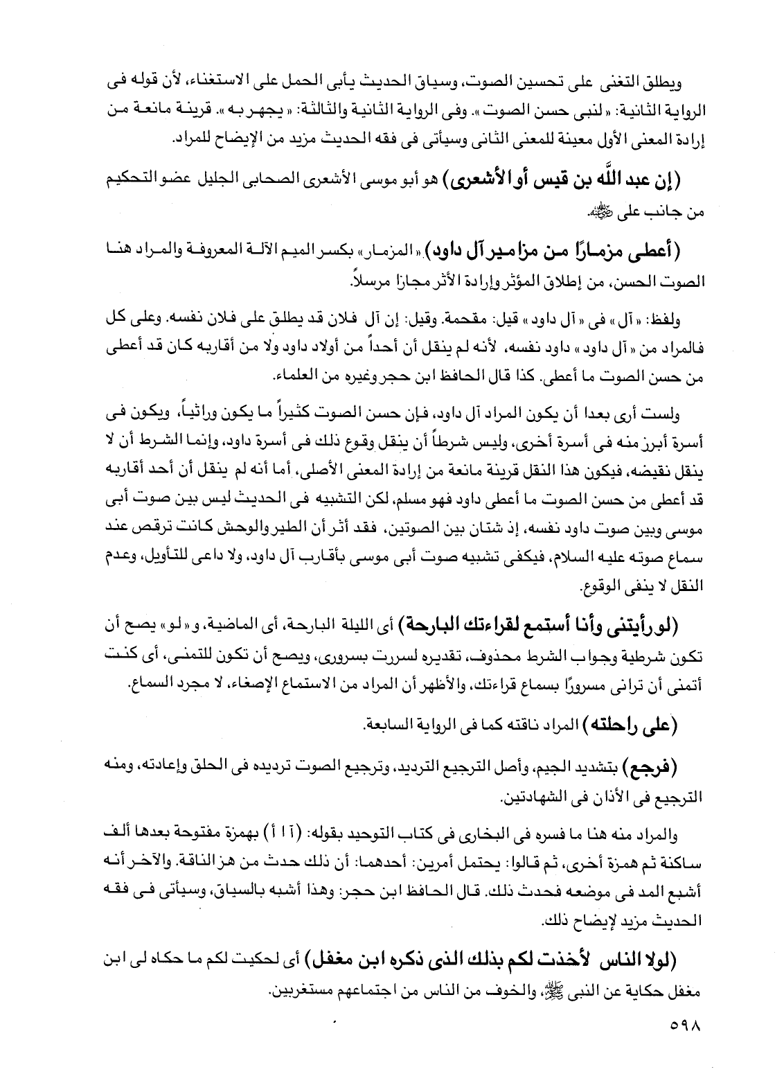 ولست أرى بعدًا أن يكون المراد آل داود، فإن حسن الصوت كثيرًا ما يكون وراثيًا، ويكون في أسرة أبرز منه في أسرة أخرى، وليس شرطًا أن ينقل وقوع ذلك في أسرة داود، وإنما الشرط أن لا ينقل نقيضه، فيكون هذا النقل قرينة مانعة من إرادة المعنى الأصلي، أما أنه لم ينقل أن أحد أقاربه قد أعطي من حسن الصوت ما أعطي داود فهو مسلم، لكن التشبيه في الحديث ليس بين صوت أبي موسى وبين صوت داود نفسه، إذ شتان بين الصوتين، فقد أثر أن الطير والوحش كانت ترقص عند سماع صوته عليه السلام، فيكفي تشبيه صوت أبي موسى بأقارب آل داود، ولا داعي للتأويل، وعدم النقل لا ينفي الوقوع.