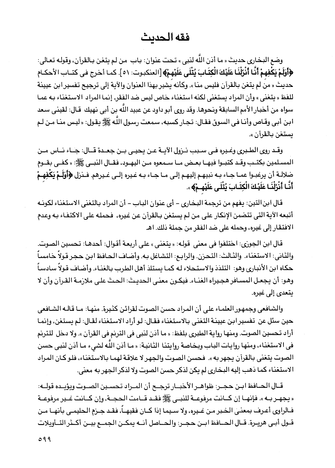 والشافعي وجمهور العلماء على أن المراد حسن الصوت لقرائن كثيرة. منها: ما قاله الشافعي حين سئل عن تفسير ابن عيينة التغني بالاستغناء فقال: لو أراد الاستغناء لقال: لم يستغن، وإنما أراد تحسين الصوت. ومنها رواية الطبري بلفظ: "ما أذن لنبي في الترنم في القرآن". ولا دخل للترنم في الاستغناء، ومنها روايات الباب وبخاصة روايتنا الثانية: "ما أذن الله لشيء ما أذن لنبي حسن الصوت يتغنى بالقرآن يجهر به". فحسن الصوت والجهر لا علاقة لهما بالاستغناء، فلو كان المراد الاستغناء كما ذهب إليه البخاري لم يكن لذكر حسن الصوت ولا لذكر الجهر به معنى.