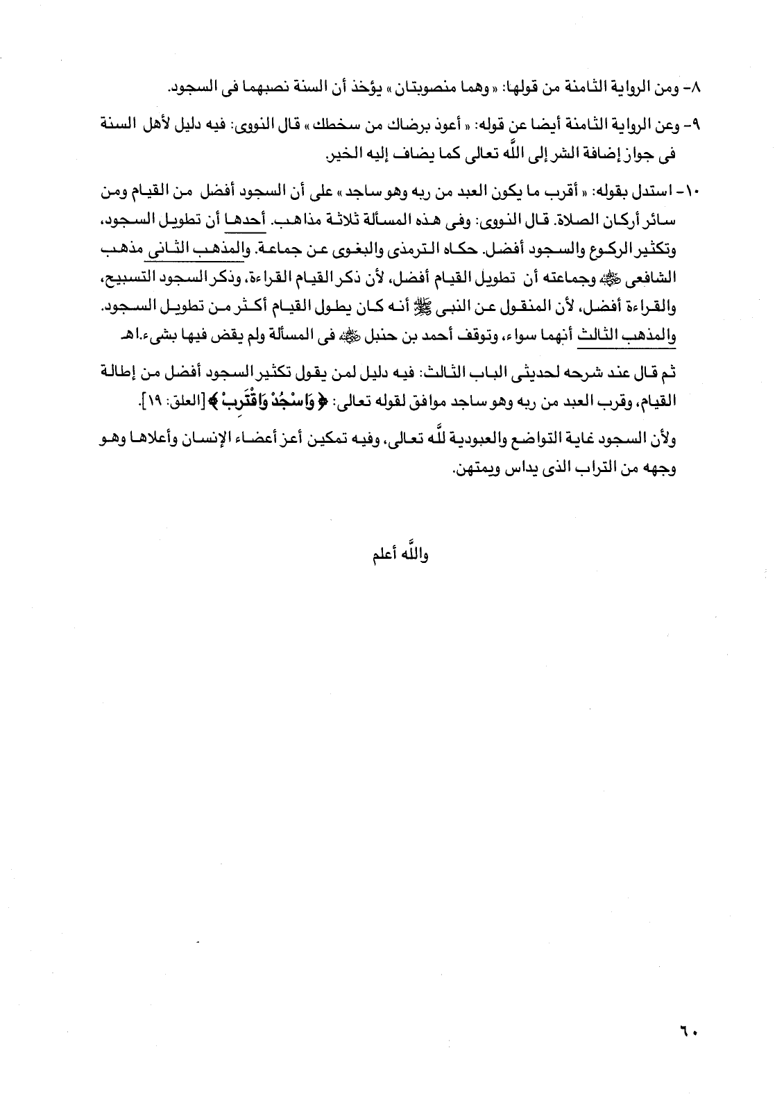 ثم قال عند شرحه لحديثي الباب الثالث: فيه دليل لمن يقول تكثير السجود أفضل من إطالة القيام، وقرب العبد من ربه وهو ساجد موافق لقوله تعالى: {واسجد واقترب} [العلق: 19]