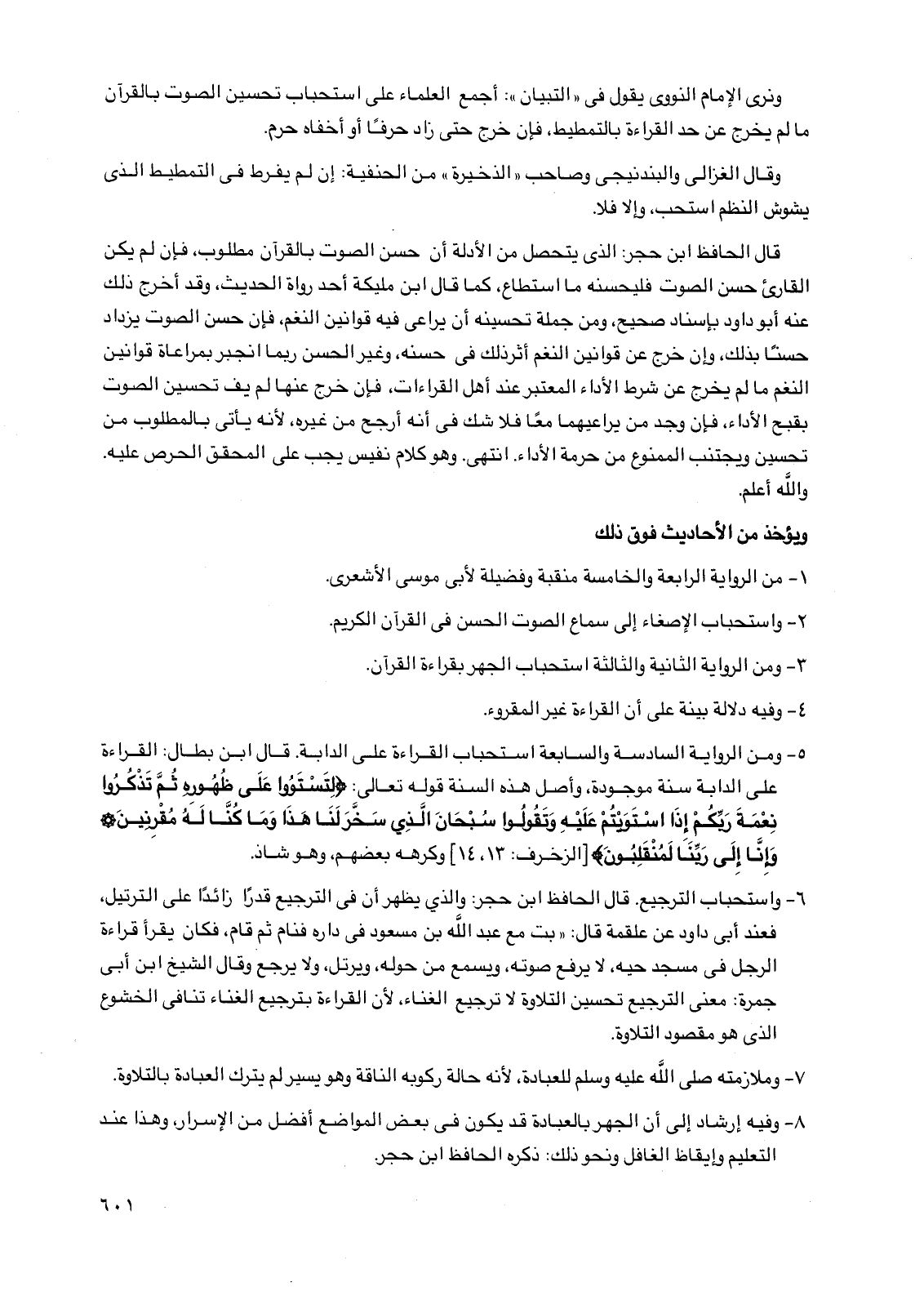 ونرى الإمام النووي يقول في "التبيان": أجمع العلماء على استحباب تحسين الصوت بالقرآن ما لم يخرج عن حد القراءة بالتمطيط، فإن خرج حتى زاد حرفًا أو أخفاه حرم.