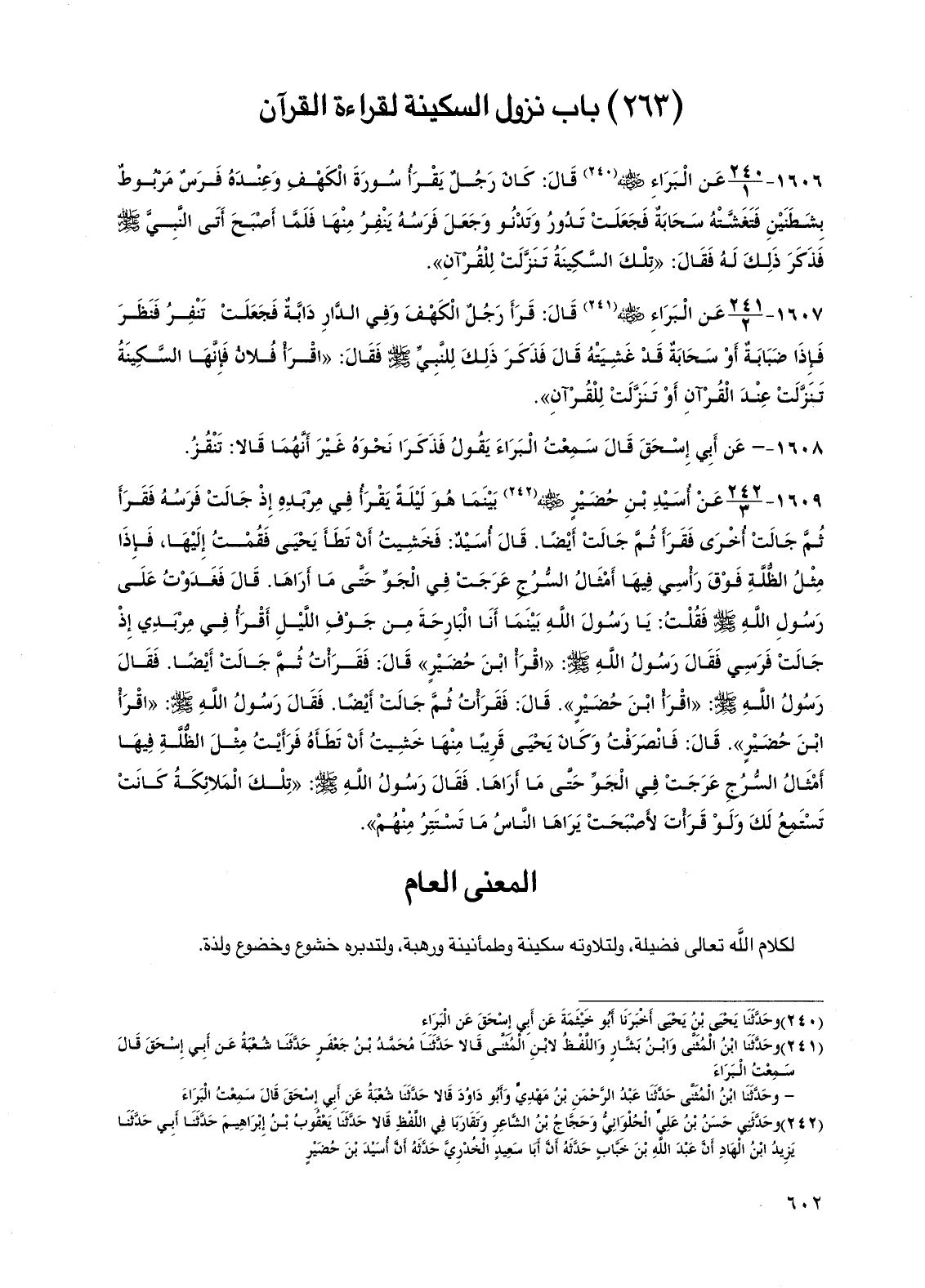 1607 - عن البراء رضي الله عنه قال: قرأ رجل الكهف وفي الدار دابة فجعلت تنفر فنظر فإذا ضبابة أو سحابة قد غشيته قال فذكر ذلك للنبي صلى الله عليه وسلم فقال: "اقرأ فلان فإنها السكينة تنزلت عند القرآن أو تنزلت للقرآن".