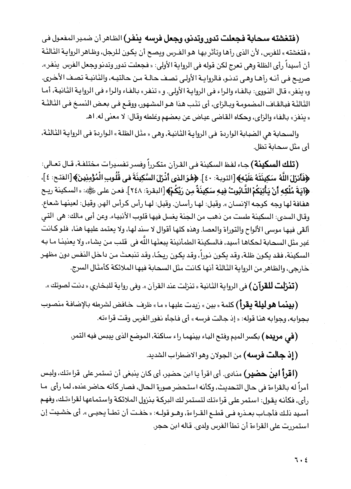(فتغشته سحابة فجعلت تدور وتدنو، وجعل فرسه ينفر) الظاهر أن ضمير المفعول في "فتغشته" للفرس، لأن الذي رآها وتأثر بها هو الفرس ويصح أن يكون للرجل، وظاهر الرواية الثالثة أن أسيدًا رأى الظلة وهي تعرج لكن قوله في الرواية الأولى: "فجعلت تدور وتدنو وجعل الفرس ينفر". صريح في أنه رآها وهي تدنو، فالرواية الأولى تصف حالة من حالتيه، والثانية تصف الأخرى. و"ينفر" قال النووي: بالفاء والراء في الرواية الأولى. و"تنفر" بالفاء والراء في الرواية الثانية، أما الثالثة فبالقاف المضمومة وبالزاي، أي تثب هذا هو المشهور، ووقع في بعض النسخ في الثالثة "ينفز" بالفاء والزاي، وحكاه القاضي عياض عن بعضهم وغلطه وقال: لا معنى له. اهـ.