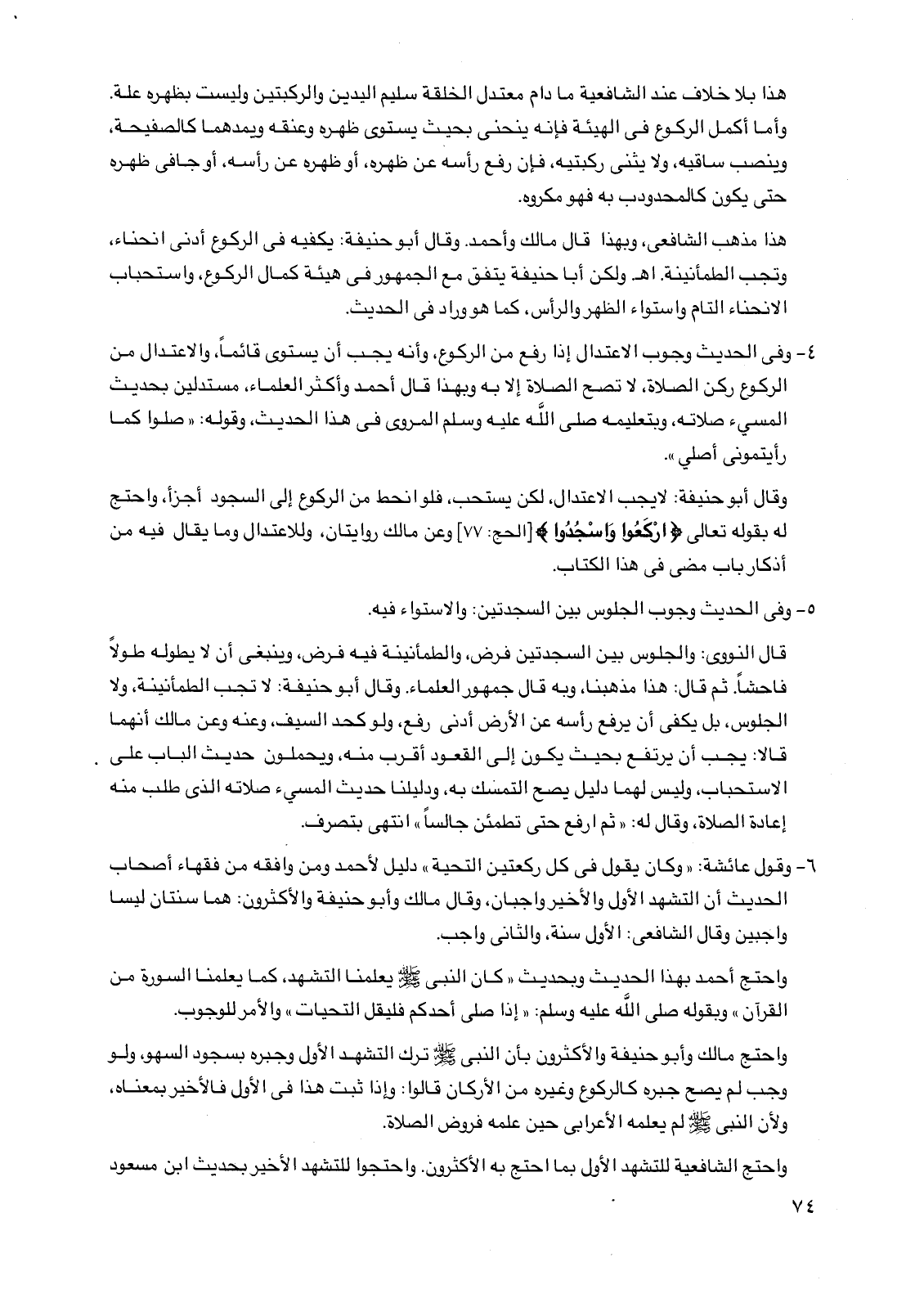 هذا مذهب الشافعي، وبهذا قال مالك وأحمد. وقال أبو حنيفة: يكفيه في الركوع أدنى انحناء، وتجب الطمأنينة. اهـ. ولكن أبا حنيفة يتفق مع الجمهور في هيئة كمال الركوع، واستحباب الانحناء التام واستواء الظهر والرأس، كما هو وارد في الحديث.