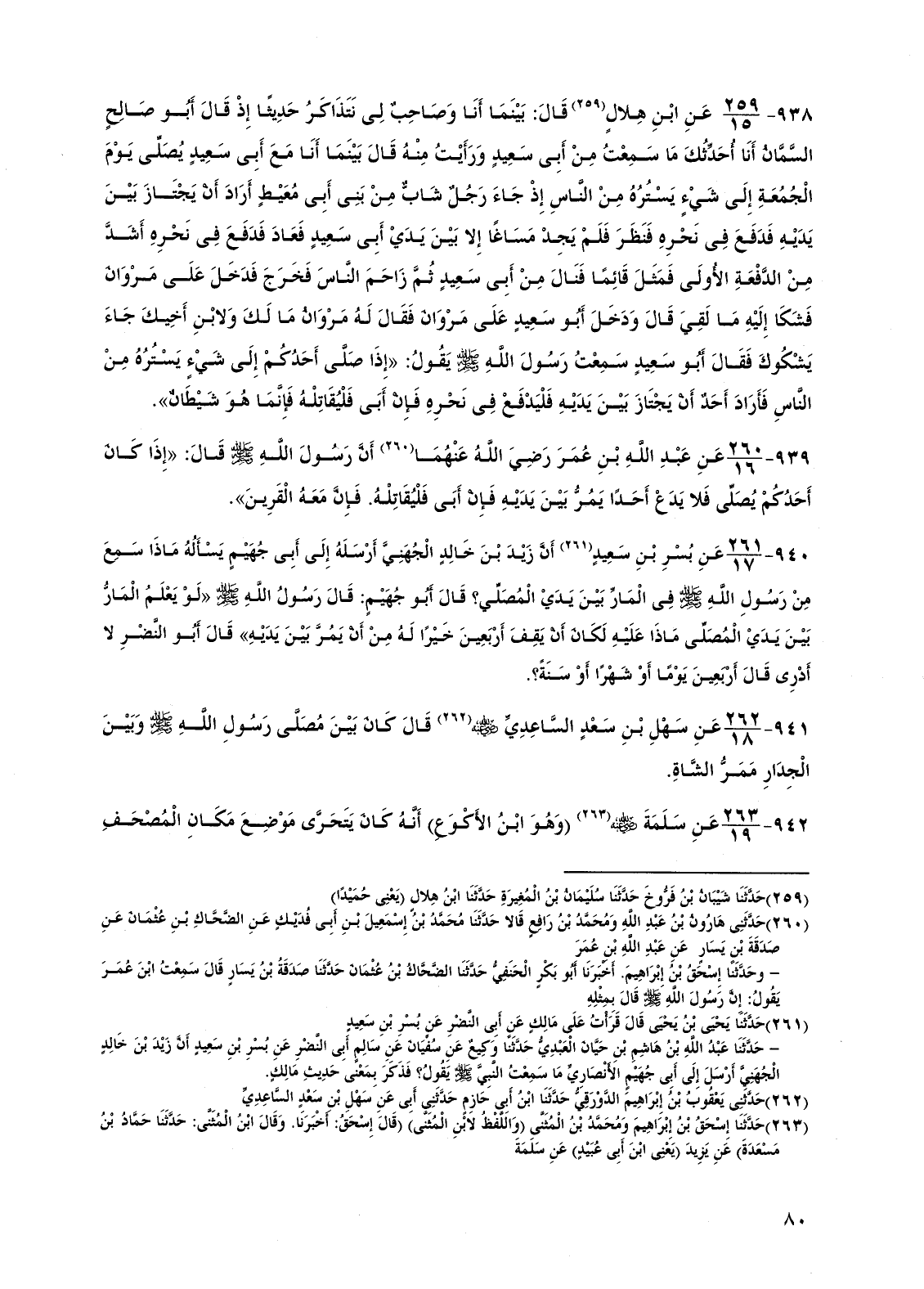 938 - عن ابن هلال قال: بينما أنا وصاحب لي نتذاكر حديثًا إذ قال أبو صالح السمان أنا أحدثك ما سمعت من أبي سعيد ورأيت منه قال بينما أنا مع أبي سعيد يصلي يوم الجمعة إلى شيء يستره من الناس إذ جاء رجل شاب من بني أبي معيط أراد أن يجتاز بين يديه فدفع في نحره فنظر فلم يجد مساغًا إلا بين يدي أبي سعيد فعاد فدفع في نحره أشد من الدفعة الأولى فمثل قائمًا فنال من أبي سعيد ثم زاحم الناس فخرج فدخل على مروان فشكا إليه ما لقي قال ودخل أبو سعيد على مروان فقال له مروان ما لك ولابن أخيك جاء يشكوك فقال أبو سعيد سمعت رسول الله صلى الله عليه وسلم يقول: "إذا صلى أحدكم إلى شيء يستره من الناس فأراد أحد أن يجتاز بين يديه فليدفع في نحره فإن أبى فليقاتله فإنما هو شيطان".