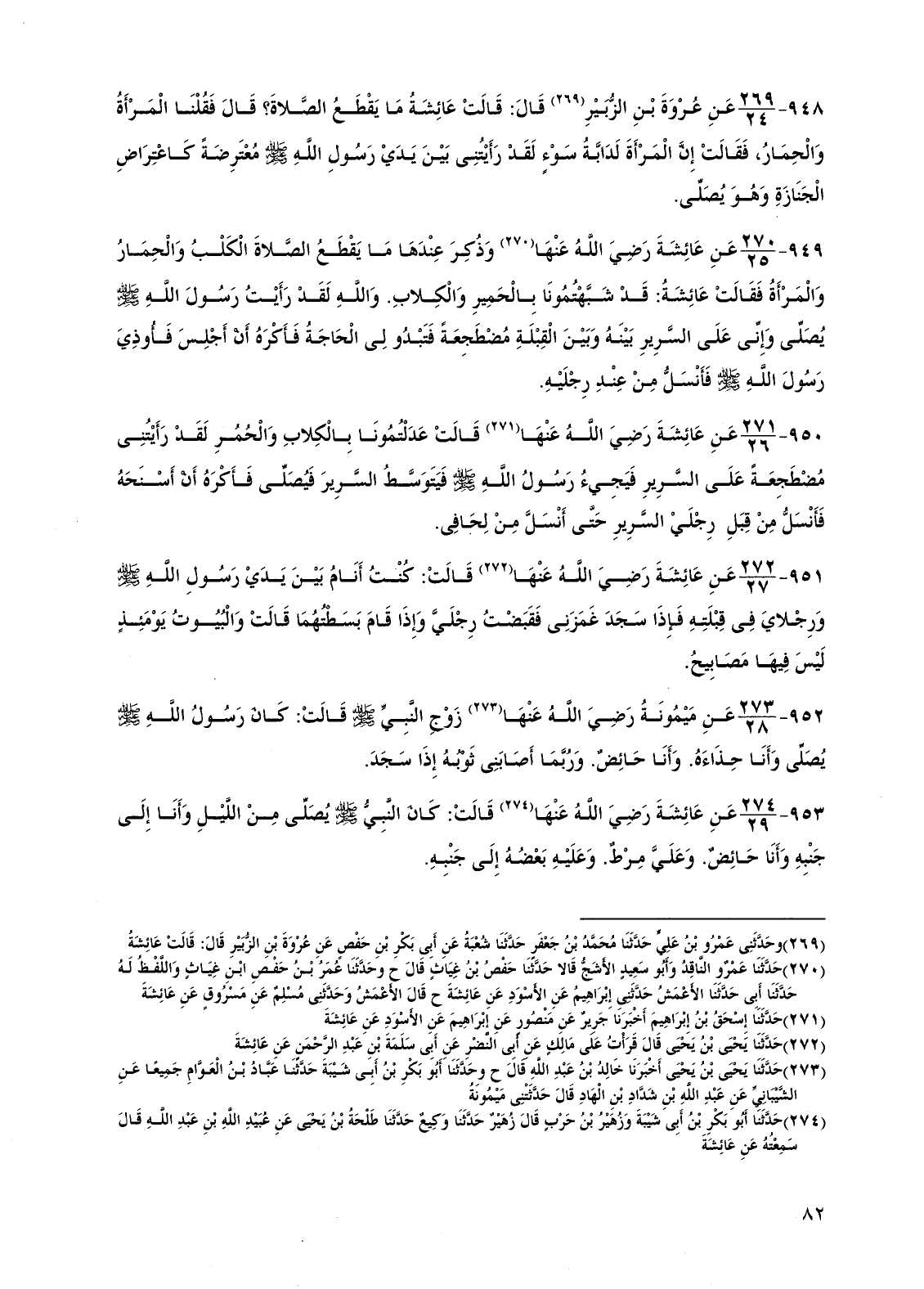 953 - عن عائشة رضي الله عنها قالت: كان النبي صلى الله عليه وسلم يصلي من الليل وأنا إلى جنبه وأنا حائض. وعلي مرط. وعليه بعضه إلى جنبه.