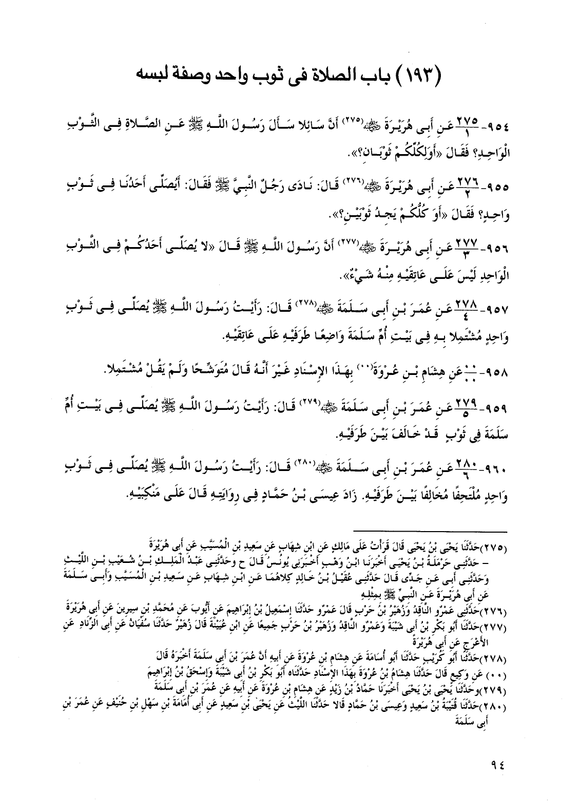 959 - عن عمر بن أبي سلمة رضي الله عنه قال: رأيت رسول الله صلى الله عليه وسلم يصلي في بيت أم سلمة في ثوب قد خالف بين طرفيه.