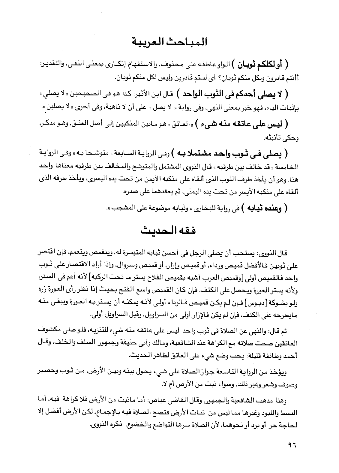ثم قال: والنهي عن الصلاة في ثوب واحد ليس على عاتقه منه شيء للتنزيه، فلو صلى مكشوف العاتقين صحت صلاته مع الكراهة عند الشافعية، ومالك وأبي حنيفة وجمهور السلف والخلف، وقال أحمد وطائفة قليلة: يجب وضع شيء على العاتق لظاهر الحديث.