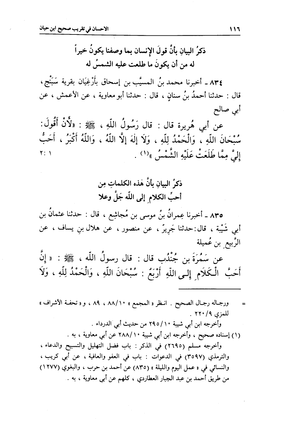 834 - أَخْبَرَنَا مُحَمَّدُ بْنُ الْمُسَيَّبِ بْنِ إِسْحَاقَ بِأَرْغِيَانَ بِقَرْيَةِ سَبَنْجَ، قَالَ: حَدَّثَنَا أَحْمَدُ بْنُ سِنَانٍ، قَالَ: حَدَّثَنَا أَبُو مُعَاوِيَةَ، عَنِ الْأَعْمَشِ، عَنْ أَبِي صَالِحٍ، عَنْ أَبِي هُرَيْرَةَ، قَالَ: قَالَ رَسُولُ اللَّهِ صَلَّى اللَّهُ عَلَيْهِ وَسَلَّمَ: «لَأَنْ أَقُولَ: سُبْحَانَ اللَّهِ، وَالْحَمْدُ لِلَّهِ، وَلَا إِلَهَ إِلَّا اللَّهُ، وَاللَّهُ أَكْبَرُ، أَحَبُّ إِلَيَّ مِمَّا طَلَعَتْ عَلَيْهِ الشَّمْسُ» (¬1) . [1: 2]