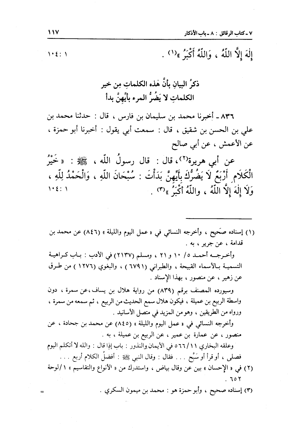 836 - أَخْبَرَنَا مُحَمَّدُ بْنُ سُلَيْمَانَ بْنِ فَارِسٍ، قَالَ: حَدَّثَنَا مُحَمَّدُ بْنُ عَلِيِّ بْنِ الْحَسَنِ بْنِ شَقِيقٍ، قَالَ: سَمِعْتُ أَبِي، يَقُولُ: أَخْبَرَنَا أَبُو حَمْزَةَ، عَنِ الْأَعْمَشِ، عَنْ أَبِي صَالِحٍ، عَنْ أَبِي هُرَيْرَةَ (¬2) ، قَالَ: قَالَ رَسُولُ اللَّهِ صَلَّى اللَّهُ عَلَيْهِ وَسَلَّمَ: «خَيْرُ الْكَلَامِ أَرْبَعٌ، لَا يَضُرُّكَ بِأَيِّهِنَّ بَدَأْتَ: سُبْحَانَ اللَّهِ، وَالْحَمْدُ لِلَّهِ، وَلَا إِلَهَ إِلَّا اللَّهُ، وَاللَّهُ أَكْبَرُ» (¬3) . [1: 104]