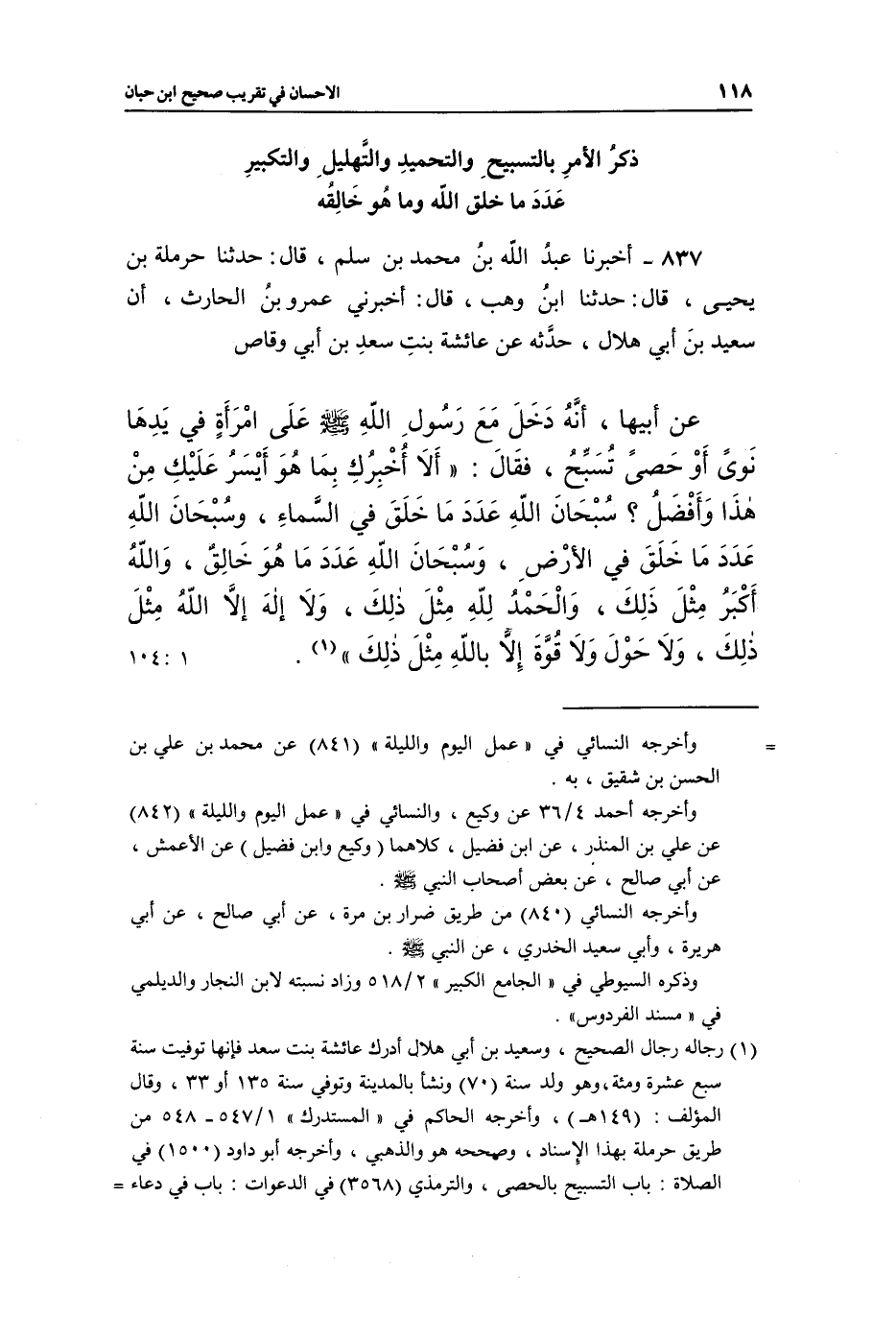 837 - أَخْبَرَنَا عَبْدُ اللَّهِ بْنُ مُحَمَّدِ بْنِ سَلْمٍ، قَالَ: حَدَّثَنَا حَرْمَلَةُ بْنُ يَحْيَى، قَالَ: حَدَّثَنَا ابْنُ وَهْبٍ، قَالَ: أَخْبَرَنِي عَمْرُو بْنُ الْحَارِثِ، أَنَّ سَعِيدَ بْنَ أَبِي هِلَالٍ حَدَّثَهُ، عَنْ عَائِشَةَ بِنْتِ سَعْدِ بْنِ أَبِي وَقَّاصٍ، عَنْ أَبِيهَا، أَنَّهُ دَخَلَ مَعَ رَسُولِ اللَّهِ صَلَّى اللَّهُ عَلَيْهِ وَسَلَّمَ عَلَى امْرَأَةٍ فِي يَدِهَا نَوًى أَوْ حَصًى تُسَبِّحُ، فَقَالَ: «أَلَا أُخْبِرُكِ بِمَا هُوَ أَيْسَرُ عَلَيْكِ مِنْ هَذَا وَأَفْضَلُ؟ سُبْحَانَ اللَّهِ عَدَدَ مَا خَلَقَ فِي السَّمَاءِ، وَسُبْحَانَ اللَّهِ عَدَدَ مَا خَلَقَ فِي الْأَرْضِ، وَسُبْحَانَ اللَّهِ عَدَدَ مَا هُوَ خَالِقٌ، وَاللَّهُ أَكْبَرُ مِثْلَ ذَلِكَ، وَالْحَمْدُ لِلَّهِ مِثْلَ ذَلِكَ، وَلَا إِلَهَ إِلَّا اللَّهُ مِثْلَ ذَلِكَ، وَلَا حَوْلَ وَلَا قُوَّةَ إِلَّا بِاللَّهِ مِثْلَ ذَلِكَ» (¬1) . [1: 104]