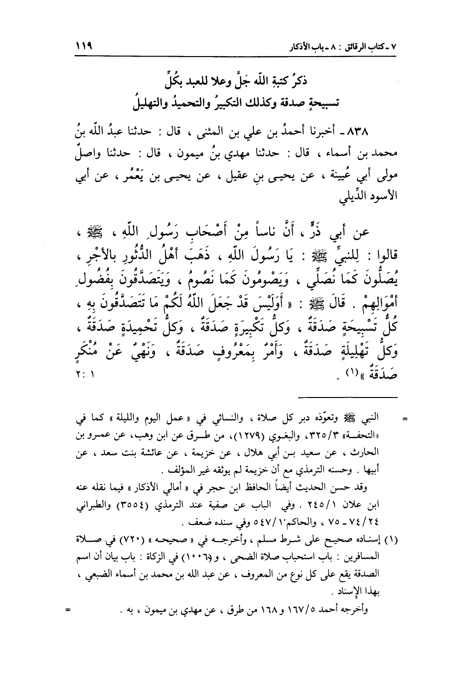 838 - أَخْبَرَنَا أَحْمَدُ بْنُ عَلِيِّ بْنِ الْمُثَنَّى، قَالَ: حَدَّثَنَا عَبْدُ اللَّهِ بْنُ مُحَمَّدِ بْنِ أَسْمَاءَ، قَالَ: حَدَّثَنَا مَهْدِيُّ بْنُ مَيْمُونٍ، قَالَ: حَدَّثَنَا وَاصِلٌ مَوْلَى أَبِي عُيَيْنَةَ، عَنْ يَحْيَى بْنِ عَقِيلٍ، عَنْ يَحْيَى بْنِ يَعْمُرَ، عَنْ أَبِي الْأَسْوَدِ الدِّيلِيِّ، عَنْ أَبِي ذَرٍّ، أَنَّ نَاسًا مِنْ أَصْحَابِ رَسُولِ اللَّهِ صَلَّى اللَّهُ عَلَيْهِ وَسَلَّمَ قَالُوا لِلنَّبِيِّ صَلَّى اللَّهُ عَلَيْهِ وَسَلَّمَ: يَا رَسُولَ اللَّهِ، ذَهَبَ أَهْلُ الدُّثُورِ بِالْأَجْرِ، يُصَلُّونَ كَمَا نُصَلِّي، وَيَصُومُونَ كَمَا نَصُومُ، وَيَتَصَدَّقُونَ بِفُضُولِ أَمْوَالِهِمْ، قَالَ صَلَّى اللَّهُ عَلَيْهِ وَسَلَّمَ: «أَولَيْسَ قَدْ جَعَلَ اللَّهُ لَكُمْ مَا تَتَصَدَّقُونَ بِهِ، كُلُّ تَسْبِيحَةٍ صَدَقَةٌ، وَكُلُّ تَكْبِيرَةٍ صَدَقَةٌ، وَكُلُّ تَحْمِيدَةٍ صَدَقَةٌ، وَكُلُّ تَهْلِيلَةٍ صَدَقَةٌ، وَأَمْرٌ بِمَعْرُوفٍ صَدَقَةٌ، وَنَهْيٌ عَنِ مُنْكَرٍ صَدَقَةٌ» (¬1) . [1: 2]