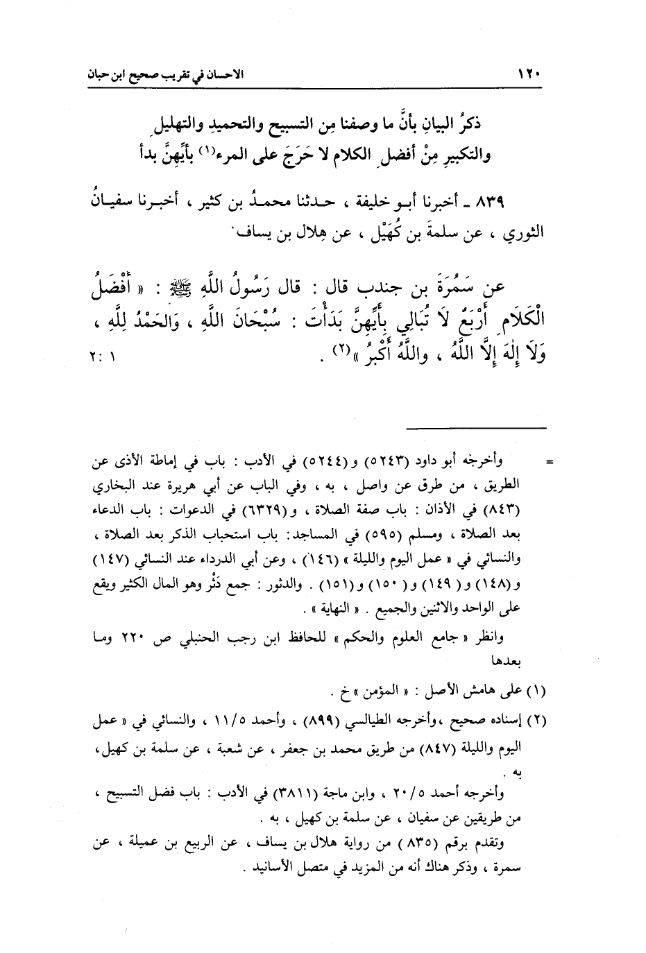 839 - أَخْبَرَنَا أَبُو خَلِيفَةَ، حَدَّثَنَا مُحَمَّدُ بْنُ كَثِيرٍ، أَخْبَرَنَا سُفْيَانُ الثَّوْرِيُّ، عَنْ سَلَمَةَ بْنِ كُهَيْلٍ، عَنْ هِلَالِ بْنِ يَسَافٍ، عَنْ سَمُرَةَ بْنِ جُنْدُبٍ، قَالَ: قَالَ رَسُولُ اللَّهِ صَلَّى اللَّهُ عَلَيْهِ وَسَلَّمَ: «أَفْضَلُ الْكَلَامِ أَرْبَعٌ، لَا تُبَالِي بِأَيِّهِنَّ بَدَأْتَ: سُبْحَانَ اللَّهِ، وَالْحَمْدُ لِلَّهِ، وَلَا إِلَهَ إِلَّا اللَّهُ، وَاللَّهُ أَكْبَرُ» (¬2) . [1: 2]