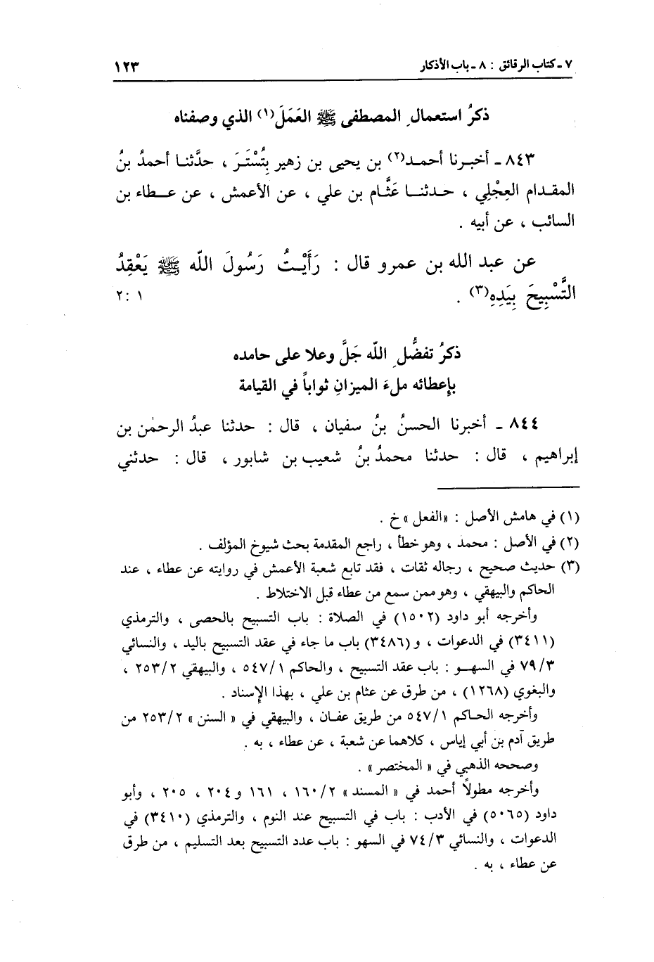 843 - أَخْبَرَنَا أَحْمَدُ (¬2) بْنُ يَحْيَى بْنِ زُهَيْرٍ بِتُسْتَرَ، حَدَّثَنَا أَحْمَدُ بْنُ الْمِقْدَامِ الْعِجْلِيُّ، حَدَّثَنَا عَثَّامُ بْنُ عَلِيٍّ، عَنِ الْأَعْمَشِ، عَنْ عَطَاءِ بْنِ السَّائِبِ، عَنْ أَبِيهِ، عَنْ عَبْدِ اللَّهِ بْنِ عَمْرٍو، قَالَ: «رَأَيْتُ رَسُولَ اللَّهِ صَلَّى اللَّهُ عَلَيْهِ وَسَلَّمَ يَعْقِدُ التَّسْبِيحَ بِيَدِهِ» (¬3) . [1: 2]