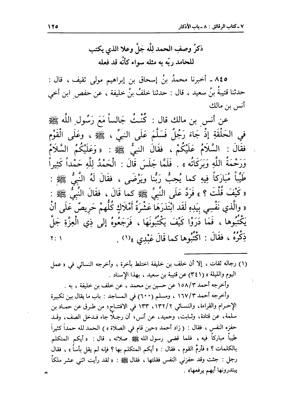 845 - أَخْبَرَنَا مُحَمَّدُ بْنُ إِسْحَاقَ بْنِ إِبْرَاهِيمَ مَوْلَى ثَقِيفٍ، قَالَ: حَدَّثَنَا قُتَيْبَةُ بْنُ سَعِيدٍ، قَالَ: حَدَّثَنَا خَلَفُ بْنُ خَلِيفَةَ، عَنْ حَفْصٍ ابْنِ أَخِي أَنَسِ بْنِ مَالِكٍ، عَنْ أَنَسِ بْنِ مَالِكٍ، قَالَ: كُنْتُ جَالِسًا مَعَ رَسُولِ اللَّهِ صَلَّى اللَّهُ عَلَيْهِ وَسَلَّمَ فِي الْحَلْقَةِ إِذْ جَاءَ رَجُلٌ فَسَلَّمَ عَلَى النَّبِيِّ صَلَّى اللَّهُ عَلَيْهِ وَسَلَّمَ وَعَلَى الْقَوْمِ، فَقَالَ: السَّلَامُ عَلَيْكُمْ، فَقَالَ النَّبِيُّ صَلَّى اللَّهُ عَلَيْهِ وَسَلَّمَ: «وَعَلَيْكُمُ السَّلَامُ وَرَحْمَةُ اللَّهِ وَبَرَكَاتُهُ» ، فَلَمَّا جَلَسَ، قَالَ: الْحَمْدُ لِلَّهِ حَمْدًا كَثِيرًا طَيِّبًا مُبَارَكًا فِيهِ كَمَا يُحِبُّ رَبُّنَا وَيَرْضَى، فَقَالَ لَهُ النَّبِيُّ صَلَّى اللَّهُ عَلَيْهِ وَسَلَّمَ: «كَيْفَ قُلْتَ؟» فَرَدَّ عَلَى النَّبِيِّ صَلَّى اللَّهُ عَلَيْهِ وَسَلَّمَ كَمَا، قَالَ، فَقَالَ النَّبِيُّ صَلَّى اللَّهُ عَلَيْهِ وَسَلَّمَ: «وَالَّذِي نَفْسِي بِيَدِهِ، لَقَدِ ابْتَدَرَهَا عَشَرَةُ أَمْلَاكٍ كُلُّهُمْ حَرِيصٌ عَلَى أَنْ يَكْتُبُوهَا، فَمَا دَرَوْا كَيْفَ يَكْتُبُونَهَا، فَرَجَعُوهُ إِلَى ذِي الْعِزَّةِ جَلَّ ذِكْرُهُ، فَقَالَ: اكْتُبُوهَا كَمَا، قَالَ عَبْدِي» (¬1) . [1: 2]