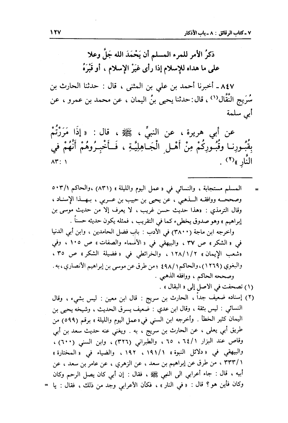 847 - أَخْبَرَنَا أَحْمَدُ بْنُ عَلِيِّ بْنِ الْمُثَنَّى، قَالَ: حَدَّثَنَا الْحَارِثُ بْنُ سُرَيْجٍ النَّقَّالُ (¬1) ، قَالَ: حَدَّثَنَا يَحْيَى بْنُ الْيَمَانِ، عَنْ مُحَمَّدِ بْنِ عَمْرٍو، عَنْ أَبِي سَلَمَةَ، عَنْ أَبِي هُرَيْرَةَ، عَنِ النَّبِيِّ صَلَّى اللَّهُ عَلَيْهِ وَسَلَّمَ، قَالَ: «إِذَا مَرَرْتُمْ بِقُبُورِنَا وَقُبُورِكُمْ مِنْ أَهْلِ الْجَاهِلِيَّةِ، فَأَخْبِرُوهُمْ أَنَّهُمْ فِي النَّارِ» (¬2) . [1: 83]