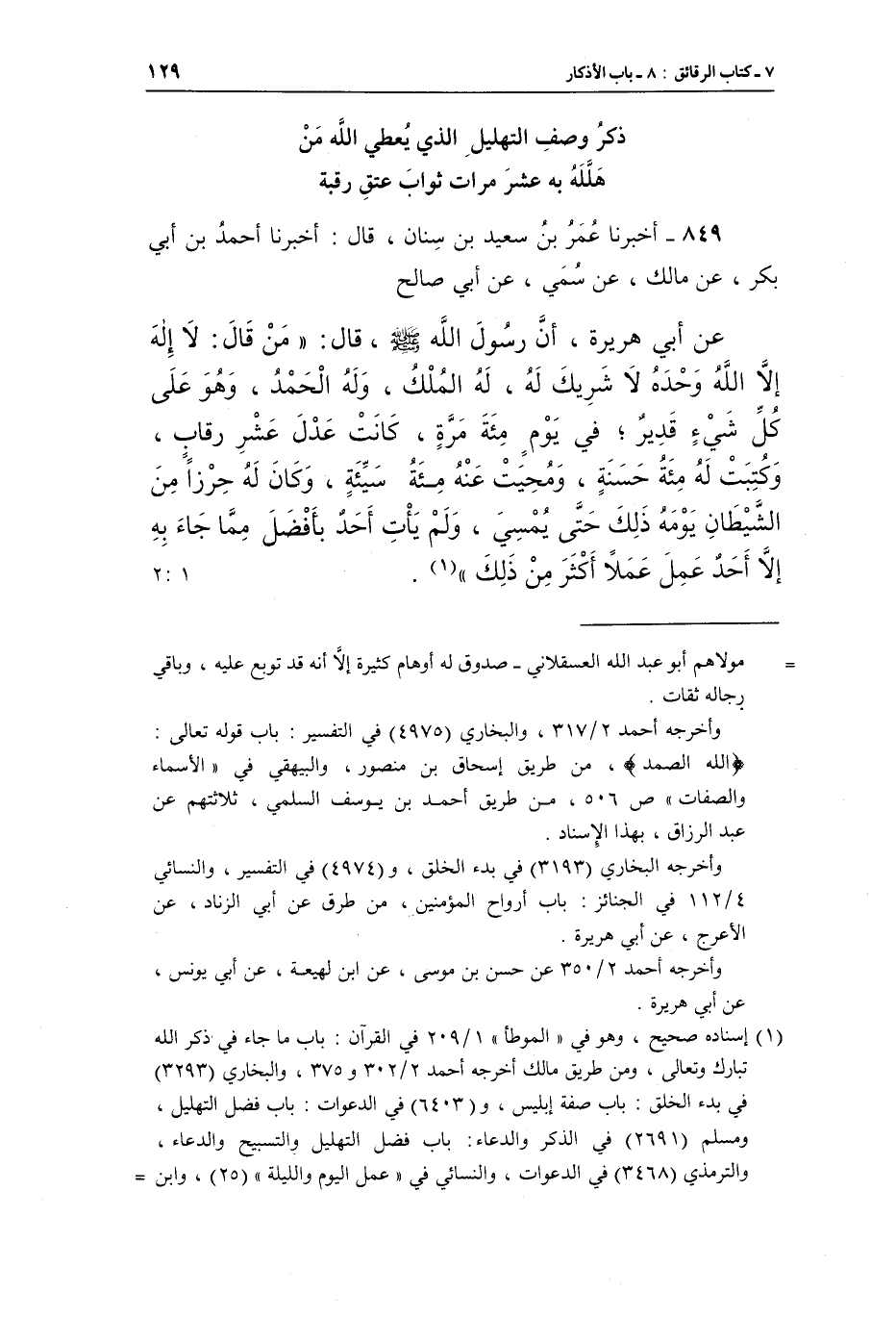 849 - أَخْبَرَنَا عُمَرُ بْنُ سَعِيدِ بْنِ سِنَانٍ، قَالَ: أَخْبَرَنَا أَحْمَدُ بْنُ أَبِي بَكْرٍ، عَنْ مَالِكٍ، عَنْ سُمَيٍّ، عَنْ أَبِي صَالِحٍ، عَنْ أَبِي هُرَيْرَةَ، أَنَّ رَسُولَ اللَّهِ صَلَّى اللَّهُ عَلَيْهِ وَسَلَّمَ، قَالَ: «مَنْ قَالَ: لَا إِلَهَ إِلَّا اللَّهُ وَحْدَهُ لَا شَرِيكَ لَهُ، لَهُ الْمُلْكُ، وَلَهُ الْحَمْدُ، وَهُوَ عَلَى كُلِّ شَيْءٍ قَدِيرٌ، فِي يَوْمٍ مِائَةَ مَرَّةٍ، كَانَتْ عَدْلَ عَشْرِ رِقَابٍ، وَكُتِبَتْ لَهُ مِائَةُ حَسَنَةٍ، وَمُحِيَتْ عَنْهُ مِائَةُ سَيِّئَةٍ، وَكَانَ لَهُ حِرْزًا مِنَ الشَّيْطَانِ يَوْمَهُ ذَلِكَ حَتَّى يُمْسِيَ، وَلَمْ يَأْتِ أَحَدٌ بِأَفْضَلَ مِمَّا جَاءَ بِهِ إِلَّا أَحَدٌ عَمِلَ عَمَلًا أَكْثَرَ مِنْ ذَلِكَ» (¬1) . [1: 2]