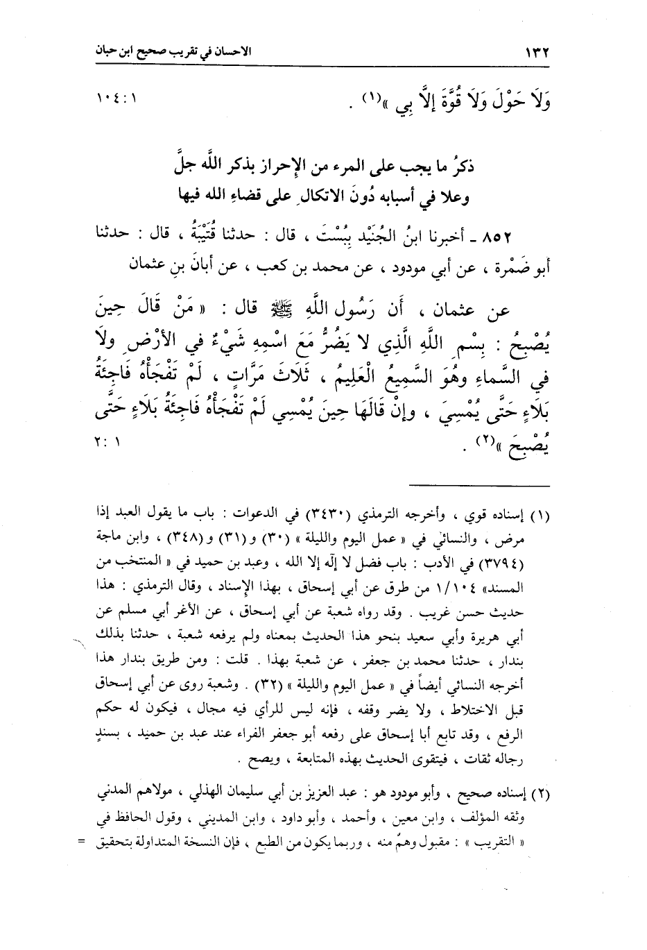 852 - أَخْبَرَنَا ابْنُ الْجُنَيْدِ بِبُسْتَ، قَالَ: حَدَّثَنَا قُتَيْبَةُ، قَالَ: حَدَّثَنَا أَبُو ضَمْرَةَ، عَنْ أَبِي مَوْدُودٍ، عَنْ مُحَمَّدِ بْنِ كَعْبٍ، عَنْ أَبَانَ بْنِ عُثْمَانَ، عَنْ عُثْمَانَ، أَنَّ رَسُولَ اللَّهِ صَلَّى اللَّهُ عَلَيْهِ وَسَلَّمَ، قَالَ: «مَنْ قَالَ حِينَ يُصْبِحُ: بِسْمِ اللَّهِ الَّذِي لَا يَضُرُّ مَعَ اسْمِهِ شَيْءٌ فِي الْأَرْضِ وَلَا فِي السَّمَاءِ وَهُوَ السَّمِيعُ الْعَلِيمُ، ثَلَاثَ مَرَّاتٍ، لَمْ تَفْجَأْهُ فَاجِئَةُ بَلَاءٍ حَتَّى يُمْسِيَ، وَإِنْ قَالَهَا حِينَ يُمْسِي لَمْ تَفْجَأْهُ فَاجِئَةُ بَلَاءٍ حَتَّى يُصْبِحَ» (¬2) . [1: 2]
