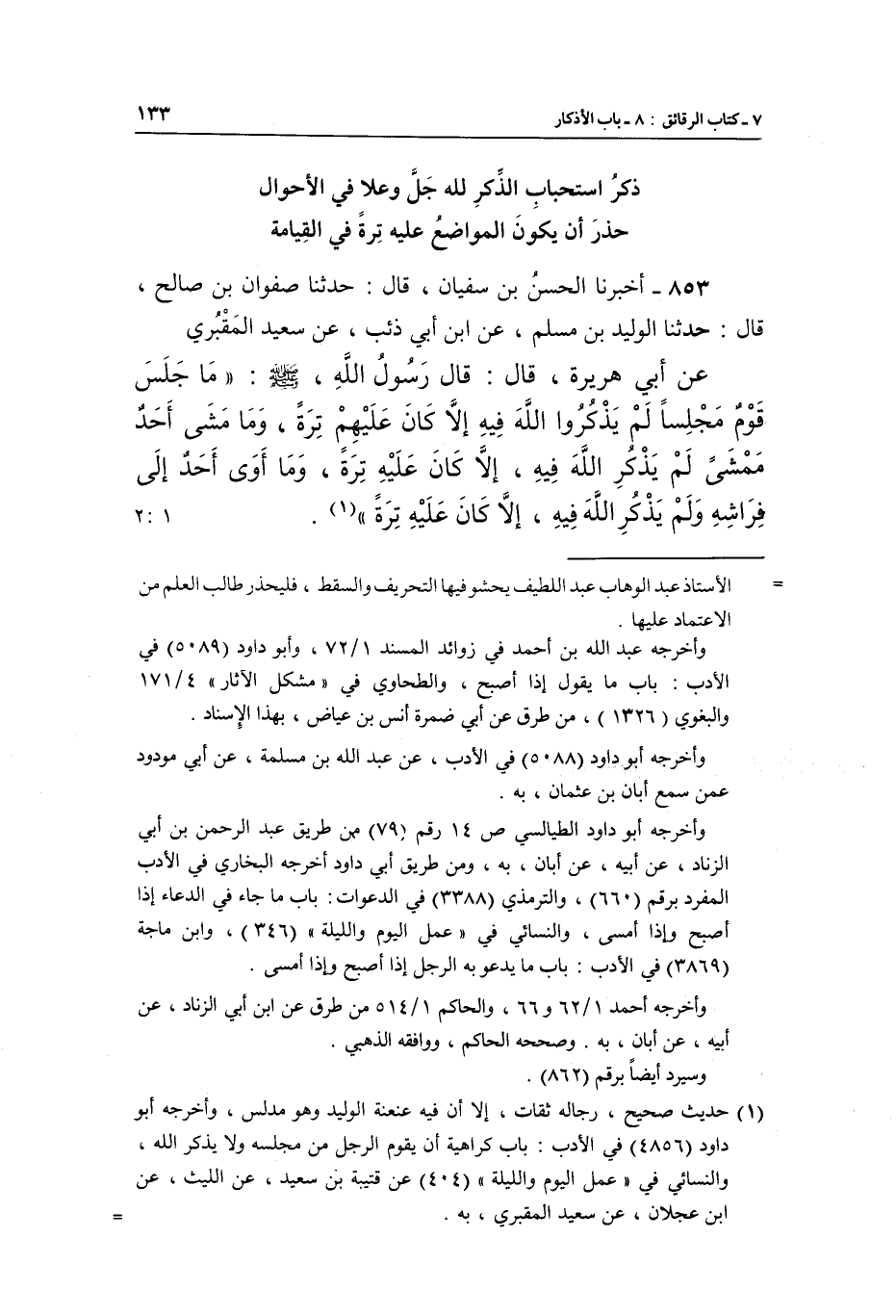 853 - أَخْبَرَنَا الْحَسَنُ بْنُ سُفْيَانَ، قَالَ: حَدَّثَنَا صَفْوَانُ بْنُ صَالِحٍ، قَالَ: حَدَّثَنَا الْوَلِيدُ بْنُ مُسْلِمٍ، عَنِ ابْنِ أَبِي ذِئْبٍ، عَنْ سَعِيدٍ الْمَقْبُرِيِّ، عَنْ أَبِي هُرَيْرَةَ، قَالَ: قَالَ رَسُولُ اللَّهِ صَلَّى اللَّهُ عَلَيْهِ وَسَلَّمَ: «مَا جَلَسَ قَوْمٌ مَجْلِسًا لَمْ يَذْكُرُوا اللَّهَ فِيهِ إِلَّا كَانَ عَلَيْهِمْ تِرَةً، وَمَا مَشَى أَحَدٌ مَمْشًى لَمْ يَذْكُرِ اللَّهَ فِيهِ إِلَّا كَانَ عَلَيْهِ تِرَةً، وَمَا أَوَى أَحَدٌ إِلَى فِرَاشِهِ وَلَمْ يَذْكُرِ اللَّهَ فِيهِ إِلَّا كَانَ عَلَيْهِ تِرَةً» (¬1) . [1: 2]