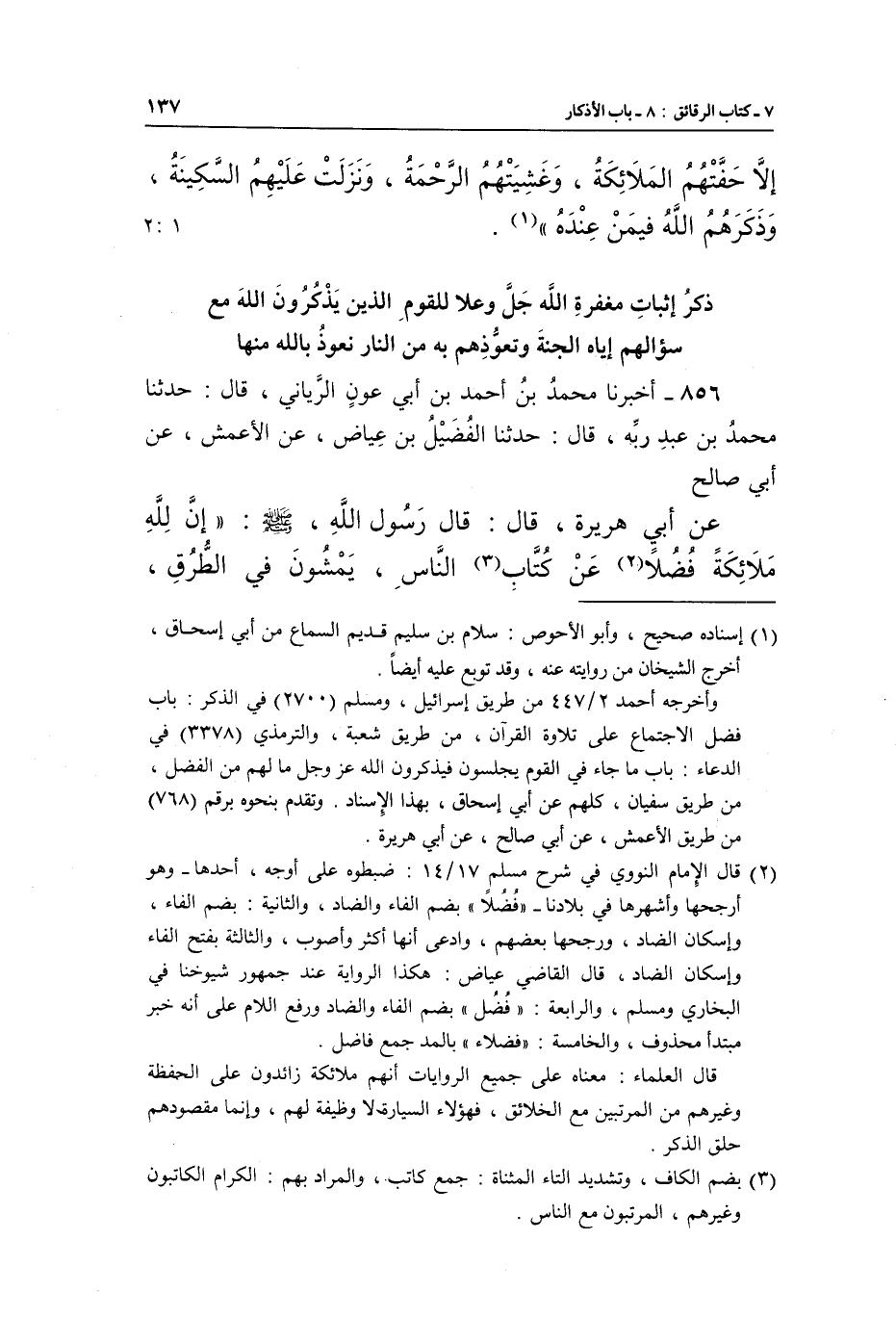 856 - أَخْبَرَنَا مُحَمَّدُ بْنُ أَحْمَدَ بْنِ أَبِي عَوْنٍ الرَّيَّانِيُّ، قَالَ: حَدَّثَنَا مُحَمَّدُ بْنُ عَبْدِ رَبِّهِ، قَالَ: حَدَّثَنَا الْفُضَيْلُ بْنُ عِيَاضٍ، عَنِ الْأَعْمَشِ، عَنْ أَبِي صَالِحٍ، عَنْ أَبِي هُرَيْرَةَ، قَالَ: قَالَ رَسُولُ اللَّهِ صَلَّى اللَّهُ عَلَيْهِ وَسَلَّمَ: «إِنَّ لِلَّهِ مَلَائِكَةً فُضُلًا (¬2) عَنْ كُتَّابِ (¬3) النَّاسِ، يَمْشُونَ فِي الطُّرُقِ،