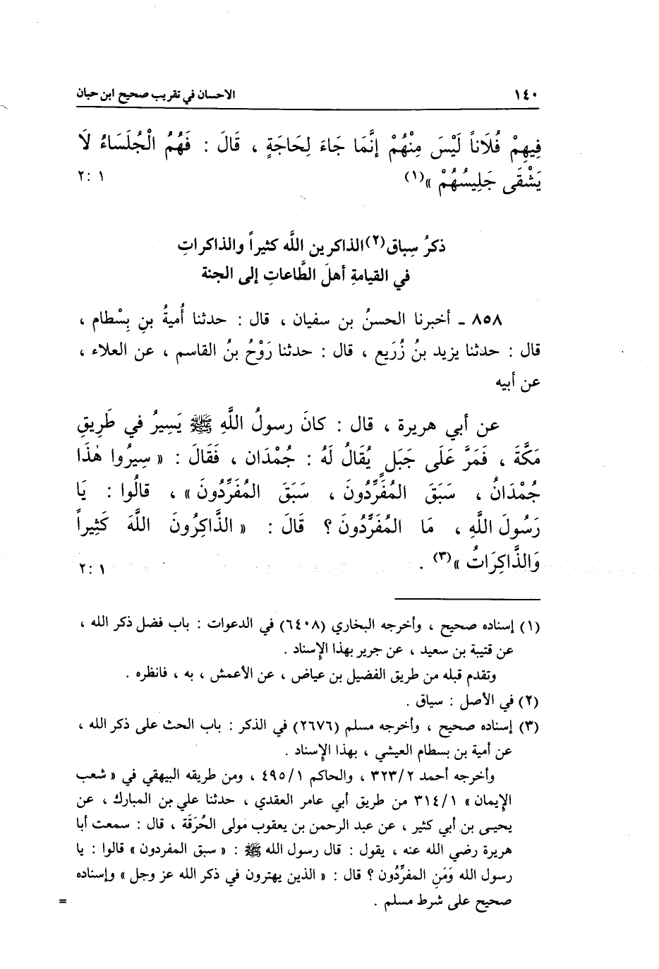 858 - أَخْبَرَنَا الْحَسَنُ بْنُ سُفْيَانَ، قَالَ: حَدَّثَنَا أُمَيَّةُ بْنُ بِسْطَامٍ، قَالَ: حَدَّثَنَا يَزِيدُ بْنُ زُرَيْعٍ، قَالَ: حَدَّثَنَا رَوْحُ بْنُ الْقَاسِمِ، عَنِ الْعَلَاءِ، عَنْ أَبِيهِ، عَنْ أَبِي هُرَيْرَةَ، قَالَ: كَانَ رَسُولُ اللَّهِ صَلَّى اللَّهُ عَلَيْهِ وَسَلَّمَ يَسِيرُ فِي طَرِيقِ مَكَّةَ فَمَرَّ عَلَى جَبَلٍ يُقَالُ لَهُ: جُمْدَانَ، فَقَالَ: «سِيرُوا هَذَا جُمْدَانُ، سَبَقَ الْمُفَرِّدُونَ، سَبَقَ الْمُفَرِّدُونَ» ، قَالُوا: يَا رَسُولَ اللَّهِ، مَا الْمُفَرِّدُونَ؟، قَالَ: «الذَّاكِرُونَ اللَّهَ كَثِيرًا وَالذَّاكِرَاتُ» (¬3) . [1: 2]