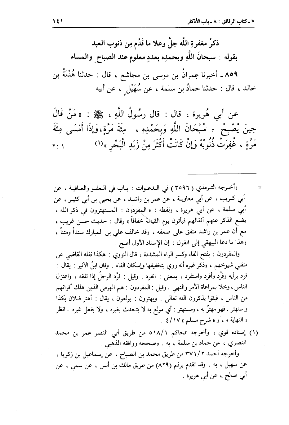 859 - أَخْبَرَنَا عِمْرَانُ بْنُ مُوسَى بْنِ مُجَاشِعٍ، قَالَ: حَدَّثَنَا هُدْبَةُ بْنُ خَالِدٍ، قَالَ: حَدَّثَنَا حَمَّادُ بْنُ سَلَمَةَ، عَنْ سُهَيْلٍ، عَنْ أَبِيهِ، عَنْ أَبِي هُرَيْرَةَ، قَالَ: قَالَ رَسُولُ اللَّهِ صَلَّى اللَّهُ عَلَيْهِ وَسَلَّمَ: «مَنْ قَالَ حِينَ يُصْبِحُ: سُبْحَانَ اللَّهِ وَبِحَمْدِهِ، مِائَةَ مَرَّةٍ، وَإِذَا أَمْسَى مِائَةَ مَرَّةٍ، غُفِرَتْ ذُنُوبُهُ وَإِنْ كَانَتْ أَكْثَرَ مِنْ زَبَدِ الْبَحْرِ» (¬1) . [1: 2]