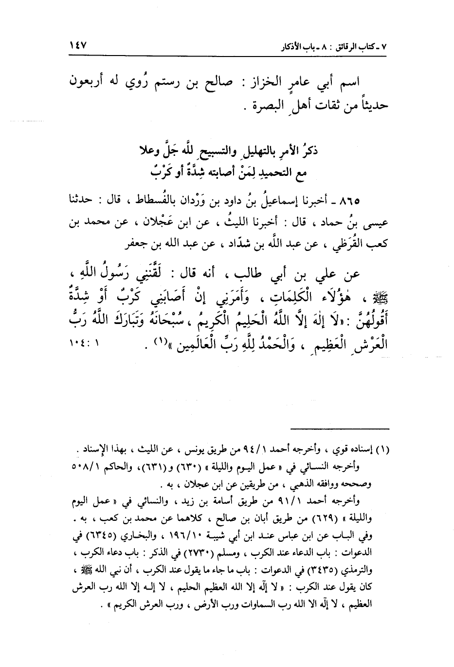 865 - أَخْبَرَنَا إِسْمَاعِيلُ بْنُ دَاوُدَ بْنِ وَرْدَانَ بِالْفُسْطَاطِ، قَالَ: حَدَّثَنَا عِيسَى بْنُ حَمَّادٍ، قَالَ: أَخْبَرَنَا اللَّيْثُ، عَنِ ابْنِ عَجْلَانَ، عَنْ مُحَمَّدِ بْنِ كَعْبٍ الْقُرَظِيِّ، عَنْ عَبْدِ اللَّهِ بْنِ شَدَّادٍ، عَنْ عَبْدِ اللَّهِ بْنِ جَعْفَرٍ، عَنْ عَلِيِّ بْنِ أَبِي طَالِبٍ، أَنَّهُ قَالَ: لَقَّنَنِي رَسُولُ اللَّهِ صَلَّى اللَّهُ عَلَيْهِ وَسَلَّمَ هَؤُلَاءِ الْكَلِمَاتِ، وَأَمَرَنِي إِنْ أَصَابَنِي كَرْبٌ أَوْ شِدَّةٌ أَقُولُهُنَّ: «لَا إِلَهَ إِلَّا اللَّهُ الْحَلِيمُ الْكَرِيمُ، سُبْحَانَهُ وَتَبَارَكَ اللَّهُ رَبُّ الْعَرْشِ الْعَظِيمِ، وَالْحَمْدُ لِلَّهِ رَبِّ الْعَالَمِينَ» (¬1) . [1: 104]