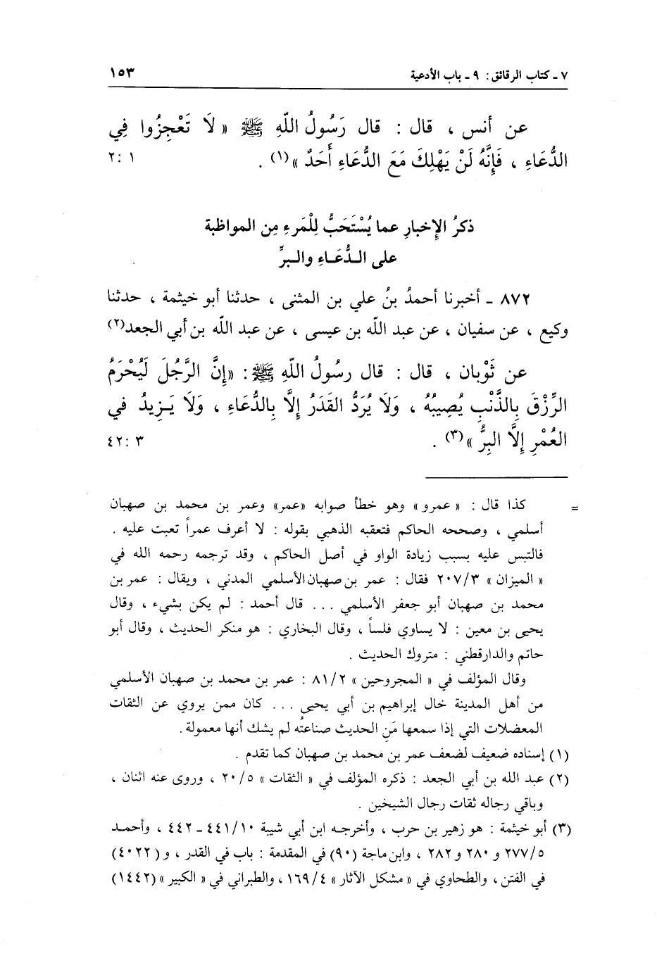 872 - أَخْبَرَنَا أَحْمَدُ بْنُ عَلِيِّ بْنِ الْمُثَنَّى، حَدَّثَنَا أَبُو خَيْثَمَةَ، حَدَّثَنَا وَكِيعٌ، عَنْ سُفْيَانَ، عَنْ عَبْدِ اللَّهِ بْنِ عِيسَى، عَنْ عَبْدِ اللَّهِ بْنِ أَبِي الْجَعْدِ (¬2) ، عَنْ ثَوْبَانَ، قَالَ: قَالَ رَسُولُ اللَّهِ صَلَّى اللَّهُ عَلَيْهِ وَسَلَّمَ: «إِنَّ الرَّجُلَ لَيُحْرَمُ الرِّزْقَ بِالذَّنْبِ يُصِيبُهُ، وَلَا يُرَدُّ الْقَدْرُ إِلَّا بِالدُّعَاءِ، وَلَا يَزِيدُ فِي الْعُمُرِ إِلَّا الْبِرُّ» (¬3) . [3: 42]