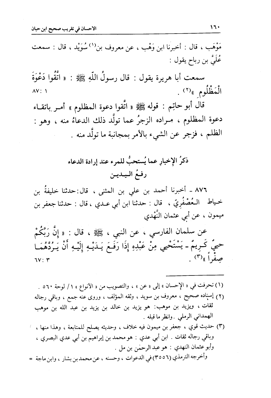 876 - أَخْبَرَنَا أَحْمَدُ بْنُ عَلِيِّ بْنِ الْمُثَنَّى، قَالَ: حَدَّثَنَا خَلِيفَةُ بْنُ خَيَّاطٍ الْعُصْفُرِيُّ، قَالَ: حَدَّثَنَا ابْنُ أَبِي عَدِيٍّ، قَالَ: حَدَّثَنَا جَعْفَرُ بْنُ مَيْمُونٍ، عَنْ أَبِي عُثْمَانَ النَّهْدِيِّ، عَنْ سَلْمَانَ الْفَارِسِيِّ، عَنِ النَّبِيِّ صَلَّى اللَّهُ عَلَيْهِ وَسَلَّمَ، قَالَ: «إِنَّ رَبَّكُمْ حَيِيٌّ كَرِيمٌ يَسْتَحْيِي مِنْ عَبْدِهِ إِذَا رَفَعَ يَدَيْهِ إِلَيْهِ أَنْ يَرُدَّهُمَا صِفْرًا» (¬3) . [3: 67]