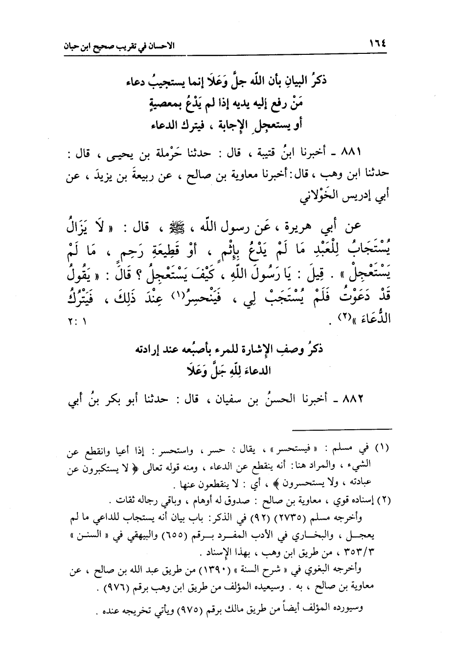 881 - أَخْبَرَنَا ابْنُ قُتَيْبَةَ، قَالَ: حَدَّثَنَا حَرْمَلَةُ بْنُ يَحْيَى، قَالَ: حَدَّثَنَا ابْنُ وَهْبٍ، قَالَ: أَخْبَرَنَا مُعَاوِيَةُ بْنُ صَالِحٍ، عَنْ رَبِيعَةَ بْنِ يَزِيدَ، عَنْ أَبِي إِدْرِيسَ الْخَوْلَانِيِّ، عَنْ أَبِي هُرَيْرَةَ، عَنْ رَسُولِ اللَّهِ صَلَّى اللَّهُ عَلَيْهِ وَسَلَّمَ، قَالَ: «لَا يَزَالُ يُسْتَجَابُ لِلْعَبْدِ مَا لَمْ يَدْعُ بِإِثْمٍ، أَوْ قَطِيعَةِ رَحِمٍ، مَا لَمْ يَسْتَعْجِلْ» ، قِيلَ: يَا رَسُولَ اللَّهِ، كَيْفَ يَسْتَعْجِلُ؟، قَالَ: « [يَقُولُ: يَا رَبِّ قَدْ دَعَوتُ و] قَدْ دَعَوْتُ فَلَمْ يُسْتَجَبْ لِي، فَيَنْحَسِرُ (¬1) عِنْدَ ذَلِكَ، فَيَتْرُكُ الدُّعَاءَ» (¬2) . [1: 2]